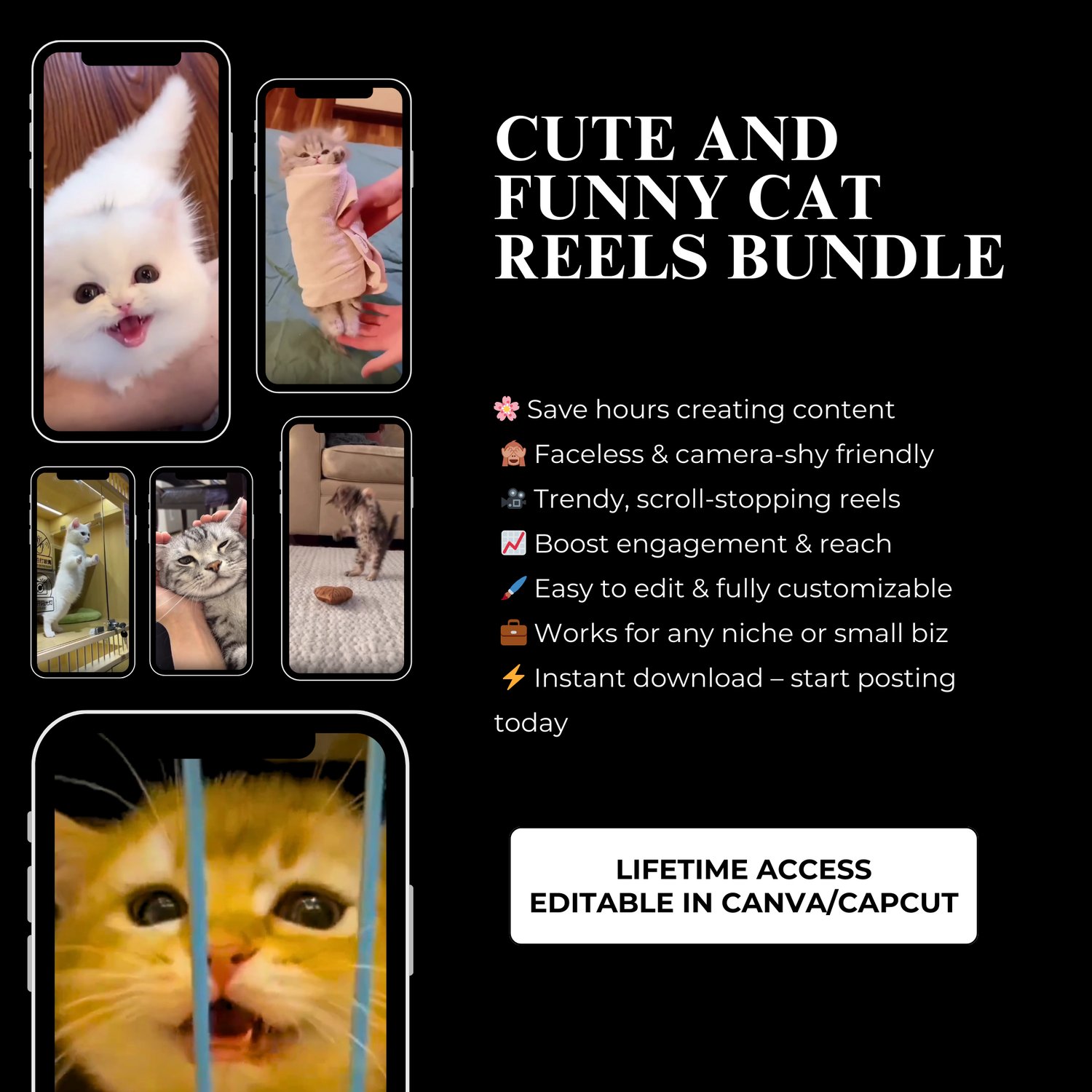 Cats never fail to capture attention online, and with this Cute and Funny Cat Reels Bundle, you’ll always have fresh content to delight your audience. Perfect for building a following, increasing engagement, and spreading smiles.