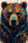 This abstract and expressive portrayal of a bear utilizes strong, vibrant colors and clean brushstrokes to render its fur. The face, serving as the focal point, is depicted with minimal surrounding detail, effectively drawing the viewer's eye to its strong, intimidating aura. The bold color choices and unconventional palette evoke a sense of abstract expressionism, conveying power and spirit.