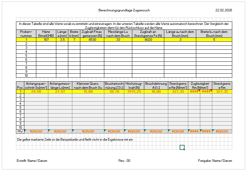 Zugversuch Excel Vorlage, Spannungs Dehnungs Berechnung, Werkstoffprüfung Excel, technische Auswertung Vorlage, Maschinenbau Excel Tool, Materialprüfung Tabelle
