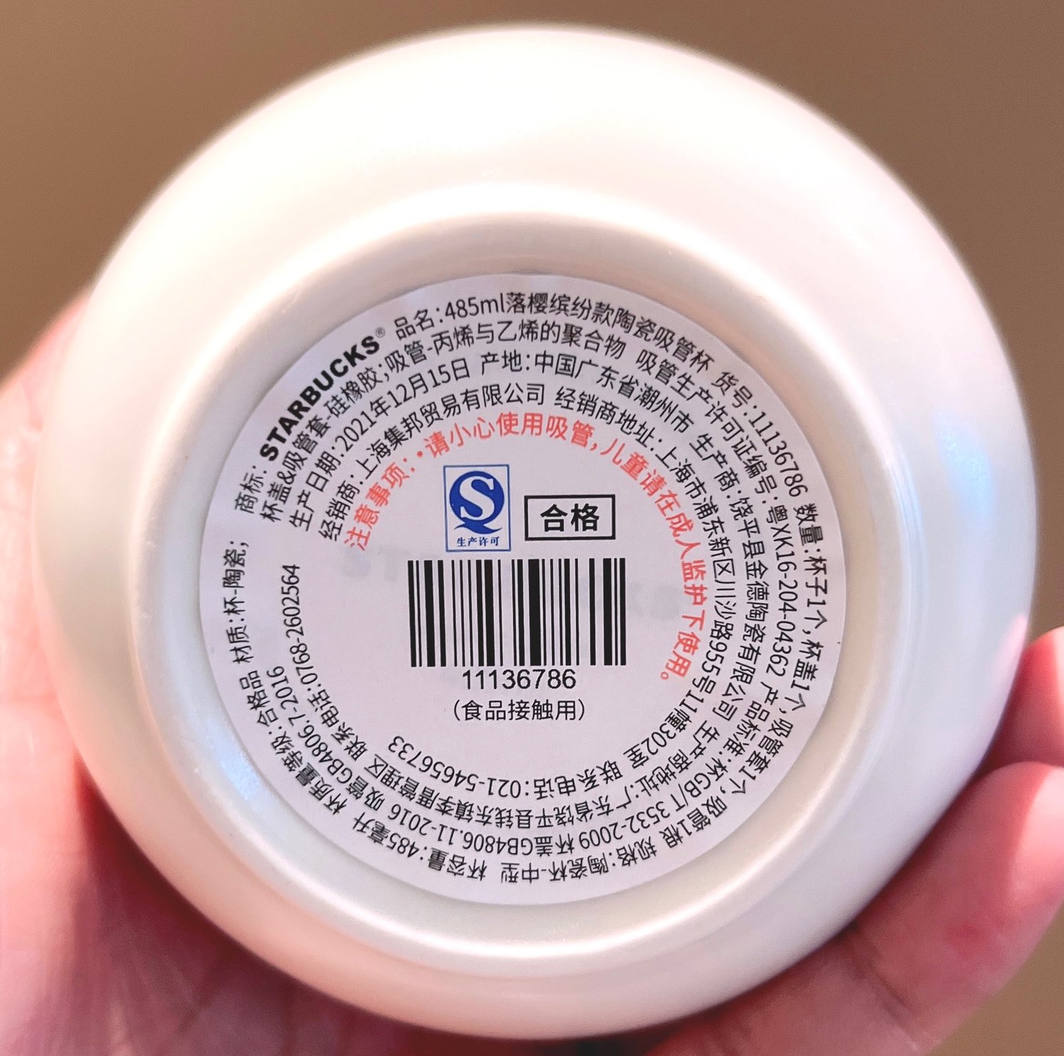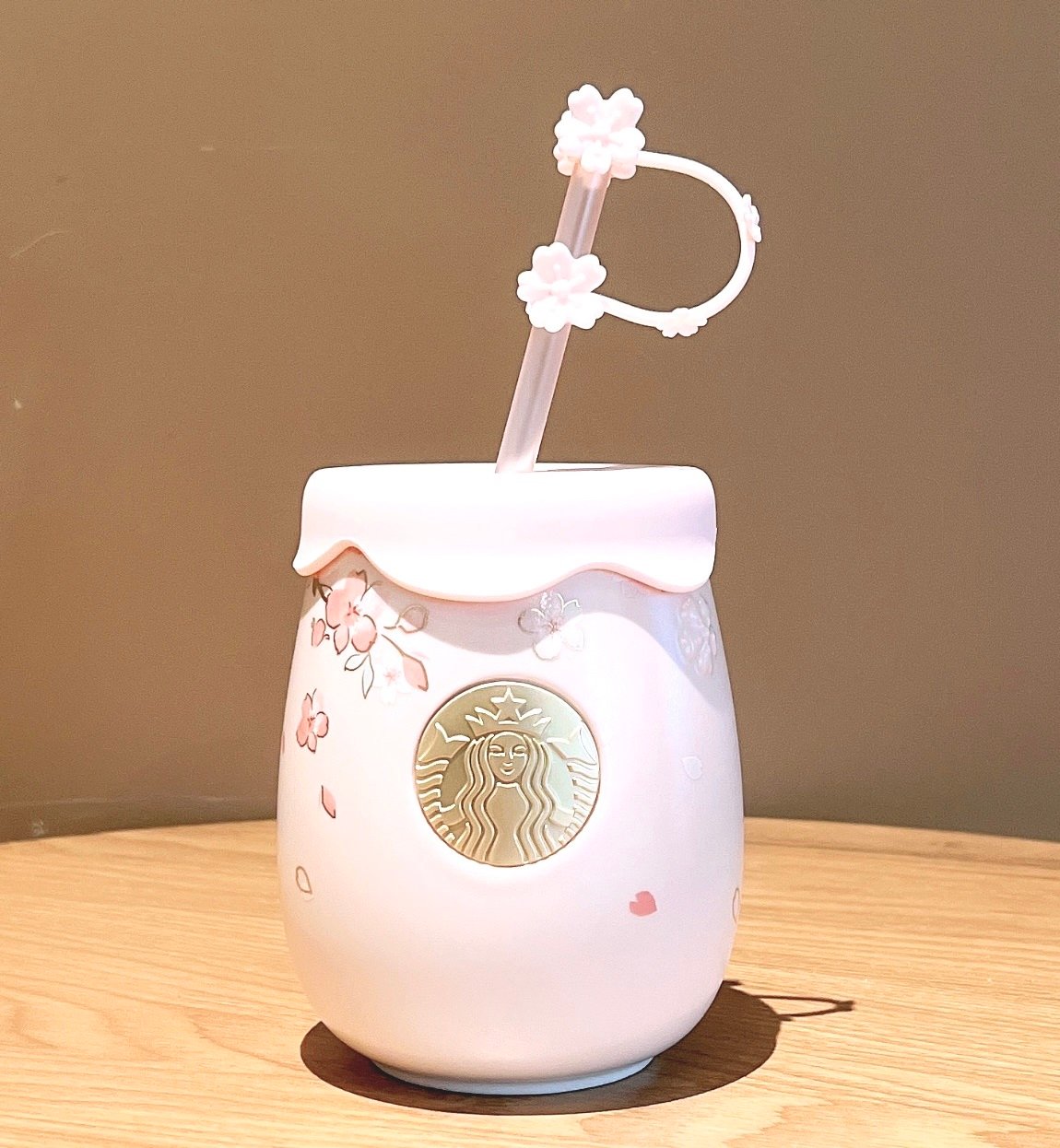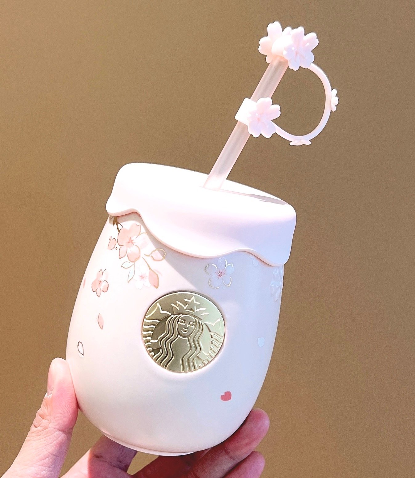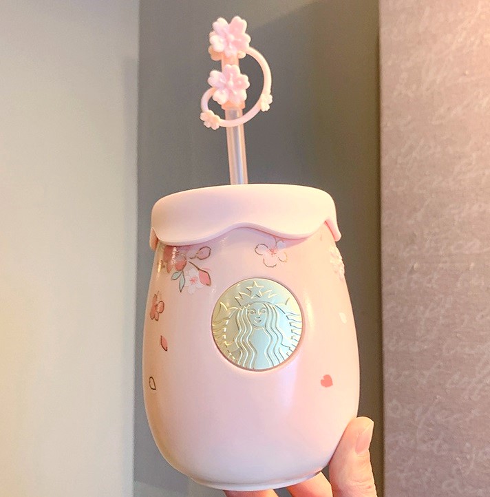 2022 Starbucks China Sakura 'Falling Cherry' 16.4oz Pink Ovoid Porcelain Siren-logo Cup with Cherry Blossom Design & Straw Topper