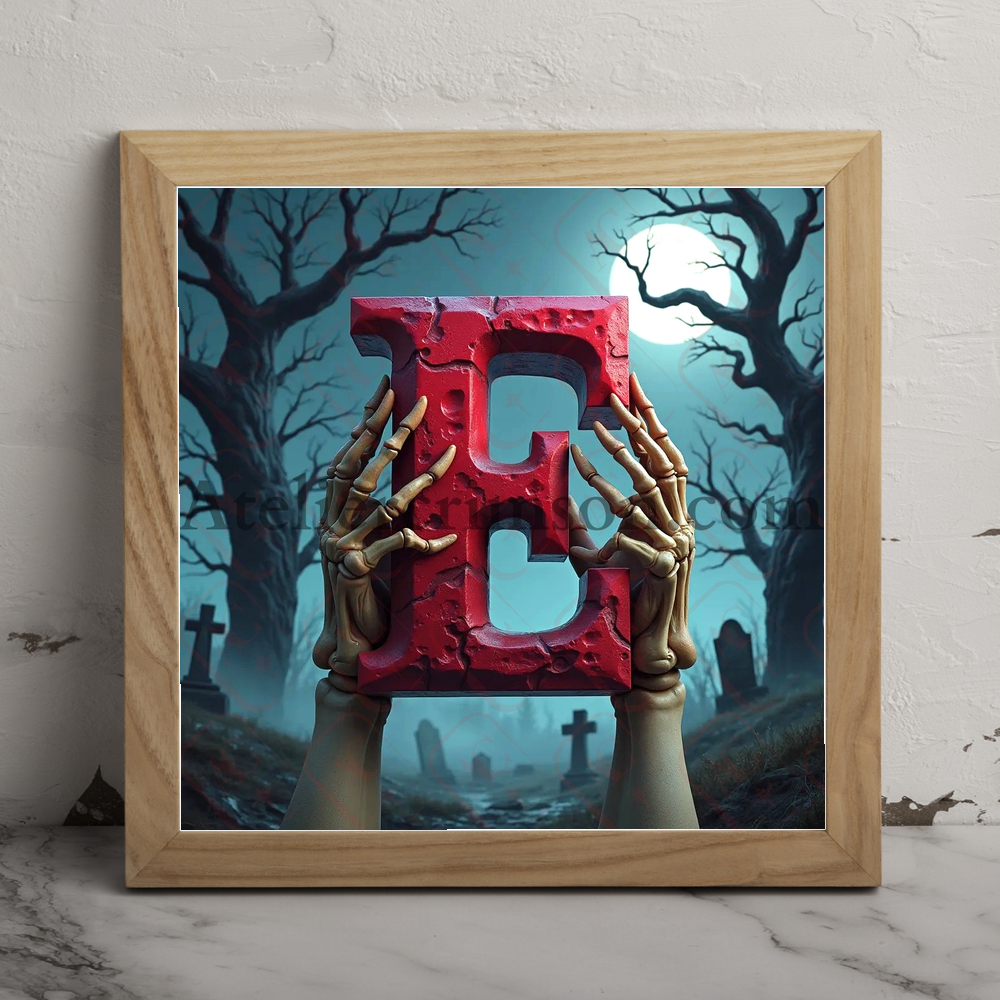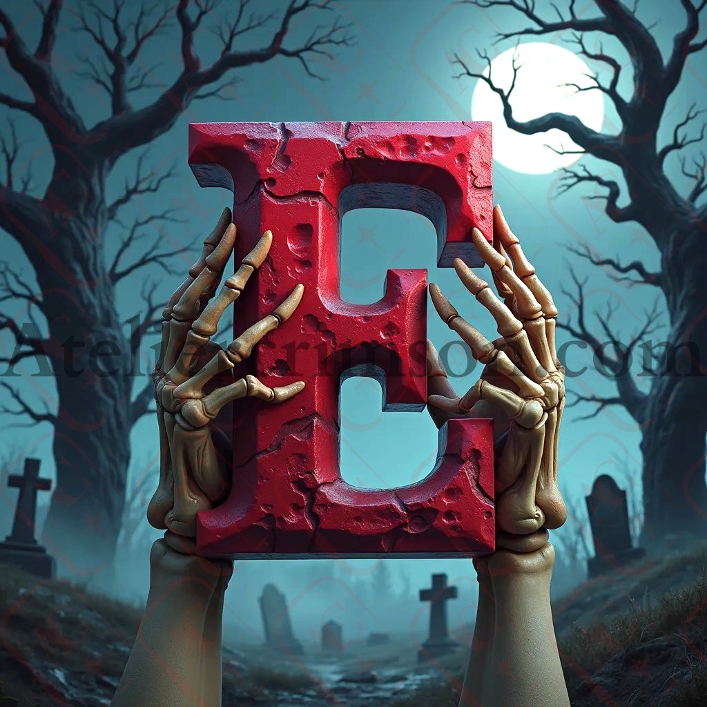 The letter E ruby halloween skull Discover our eerie alphabet series featuring photorealistic ruby letters and numbers. Each character, crafted from deep red gemstone, floats mysteriously in a misty graveyard. Skeletal hands frame these gleaming symbols against a moonlit, Halloween-inspired backdrop. Perfect for gothic design projects or seasonal decor inspiration!