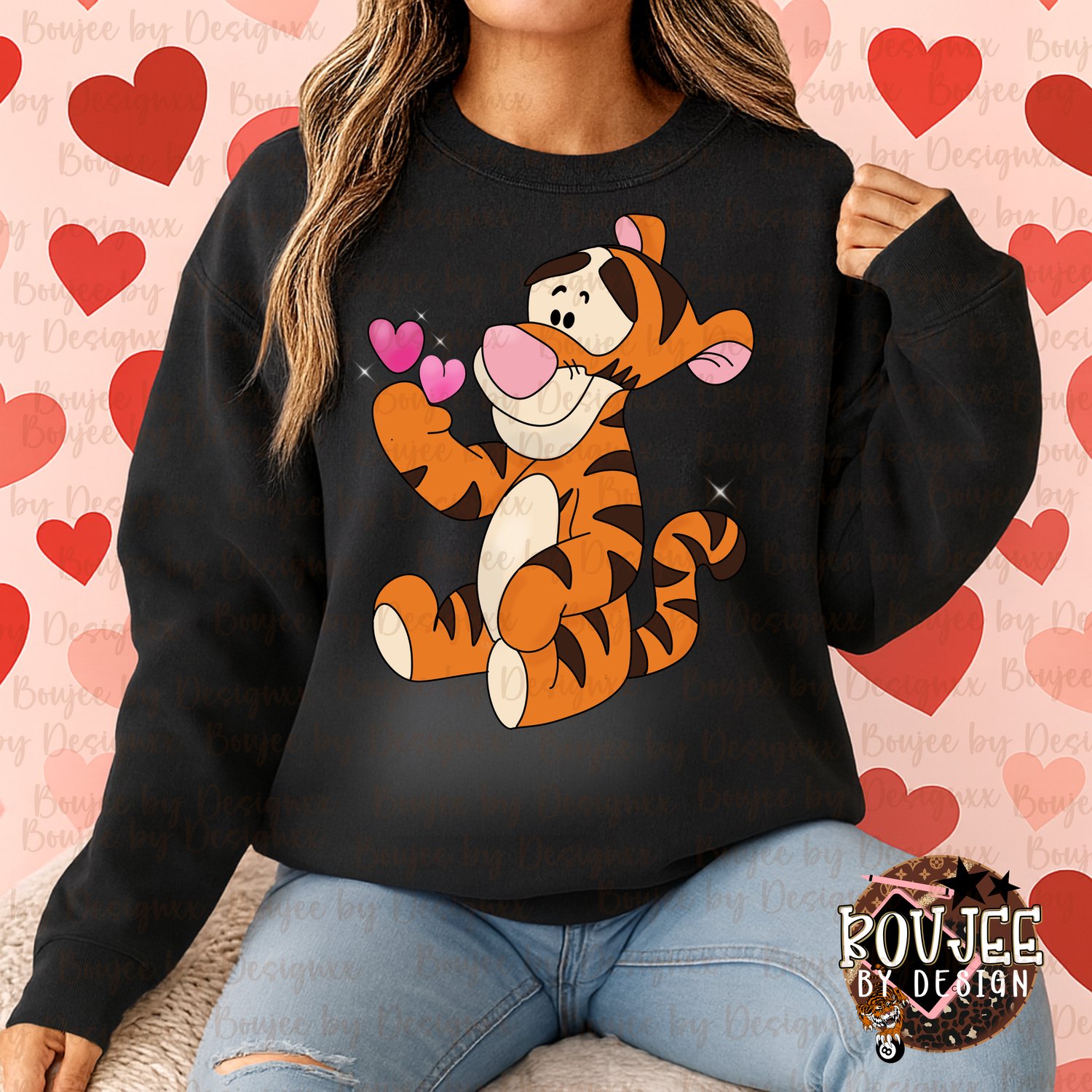 Spread some bouncy Valentine joy with this adorable tiger character holding little pink hearts! This high-quality PNG is perfect for Valentine tees, kids’ shirts, mugs, tumblers, stickers, and more.