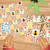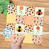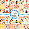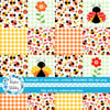 Ladybug, flowers and gingham patchwork in red, orange and yellow.