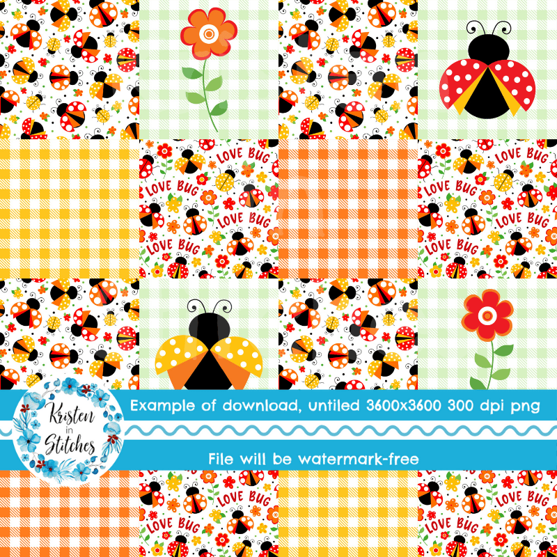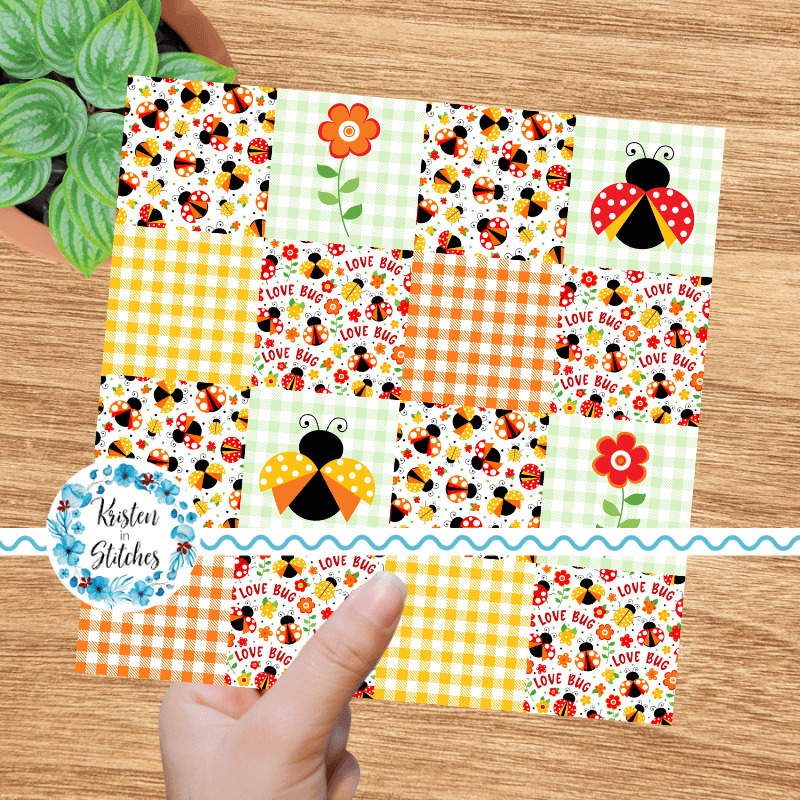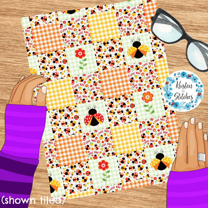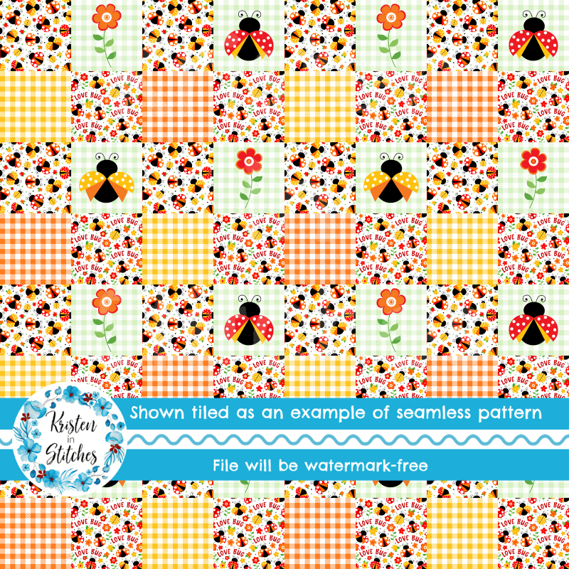 Ladybug Patchwork Seamless Pattern, Red Orange Yellow Love Bug