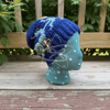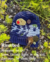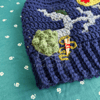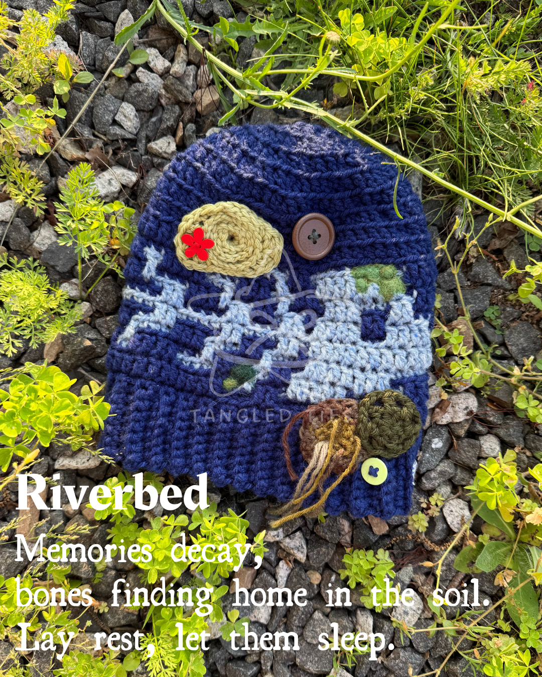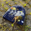 A dark blue crochet beanie with light blue mosaic colorwork in the shape of a fish skeleton. Textured crochet and needlefelted "moss" is scattered around with button and bead accents.