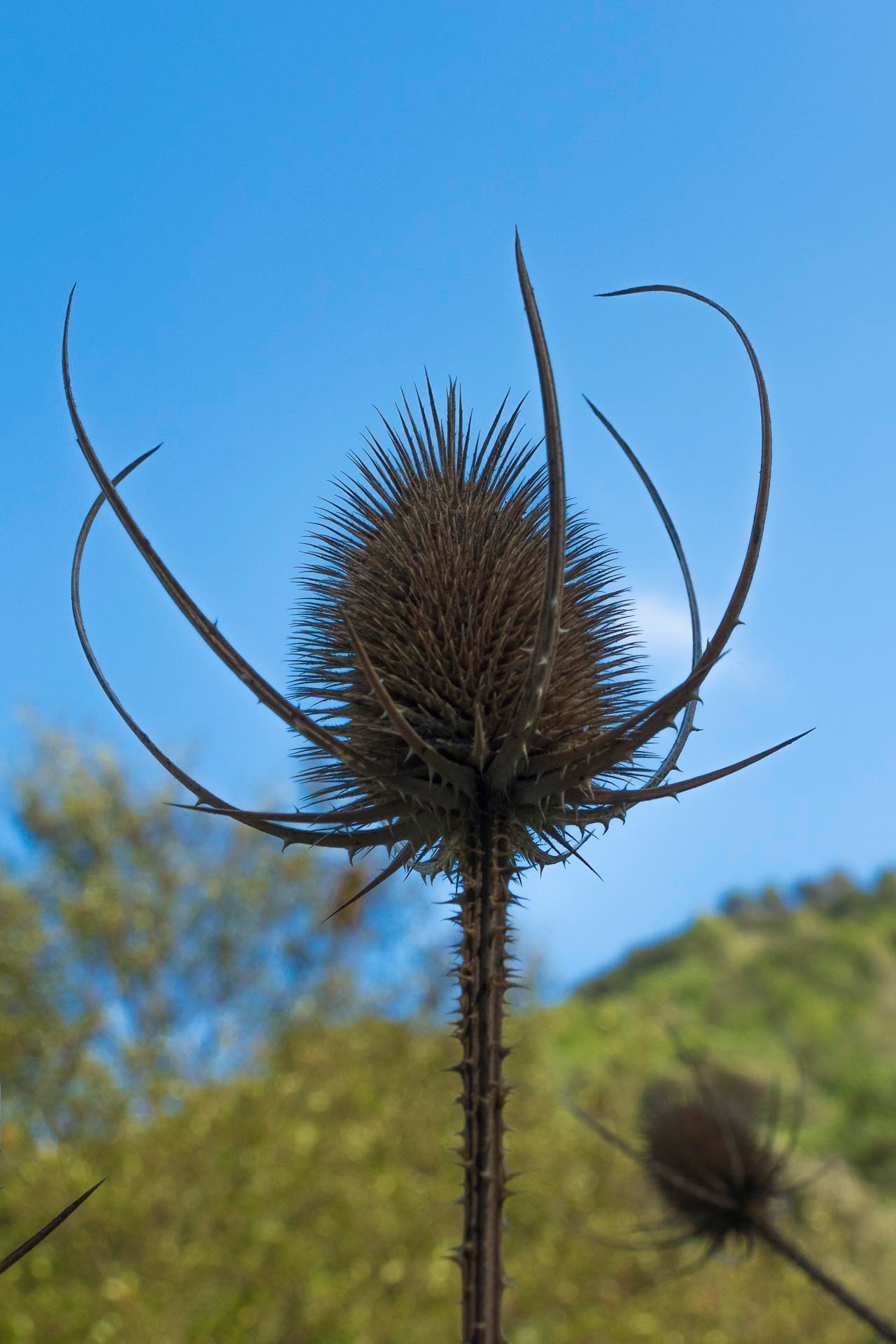 Thistle (Dipsacus fullonum) in backlight with forest and blue sky behind