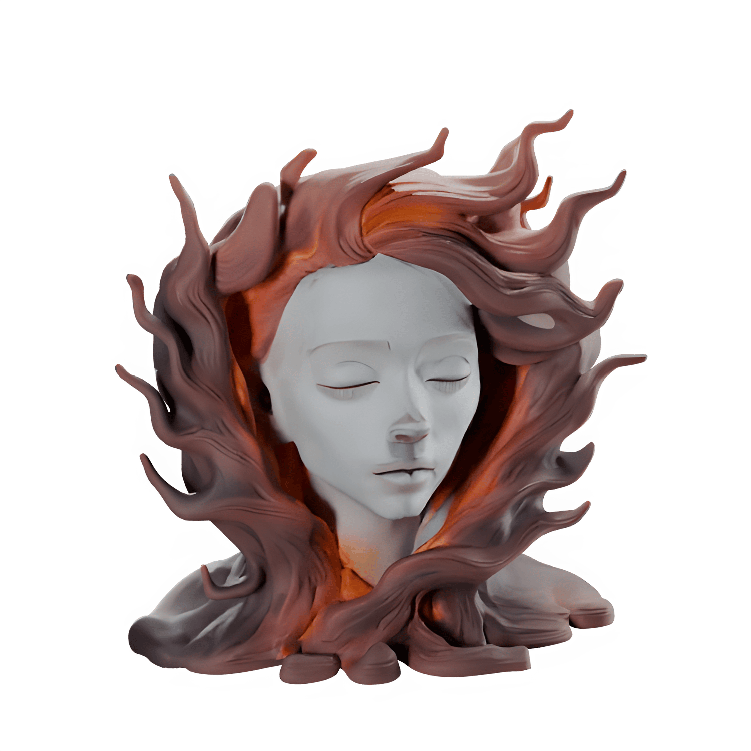 The "Ethereal Flame Bust" is a captivating 3D design featuring a serene face encircled by flowing, flame-like tendrils. The design evokes the duality of calm and energy, with intricate details in the swirling strands, giving the illusion of fire, lava, or abstract organic forms. This piece can be printed for home décor, artistic collections, or even as a centerpiece for themed events. The aesthetic mix of smooth facial features and dynamic, swirling elements offers a sense of tranquility combined with power, perfect for those seeking a unique and artistic touch in their space.