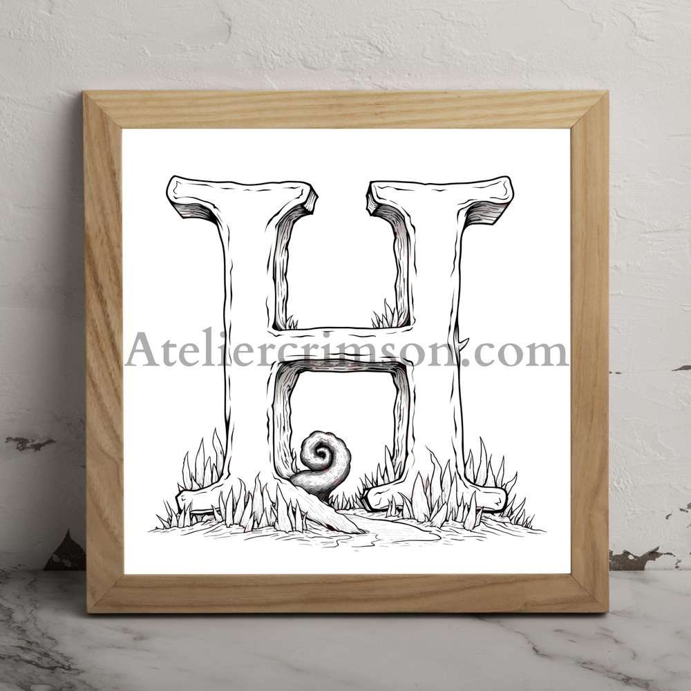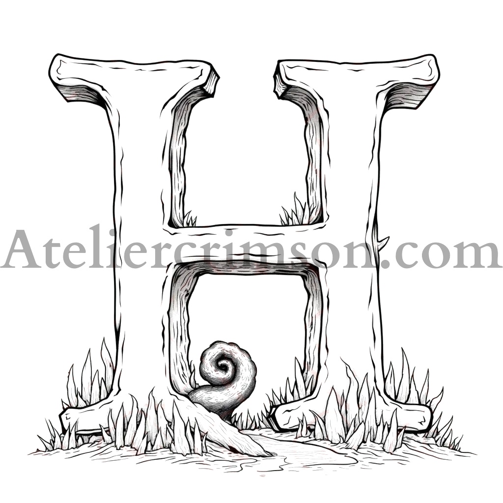 The letter H colloring book jack halloween Tim Burton-inspired alphabet art. Spooky-cute character in coloring book style. Perfect for Halloween crafts or gothic decor.