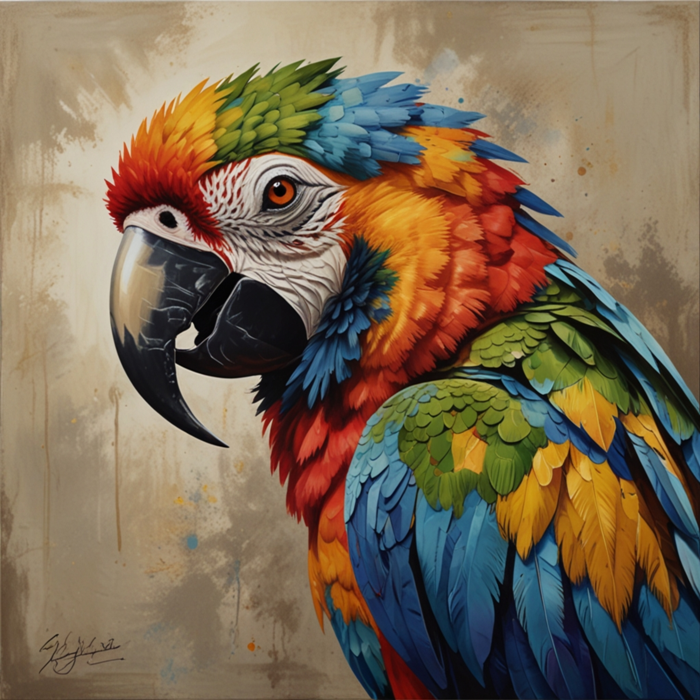 The image features a vibrant and colorful bird with a black beak, resembling a macaw or parrot. The bird's feathers are beautifully painted, showcasing a mix of bright colors. The artwork captures the essence of the bird's beauty and uniqueness.