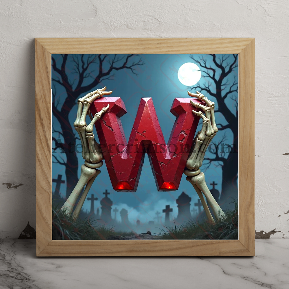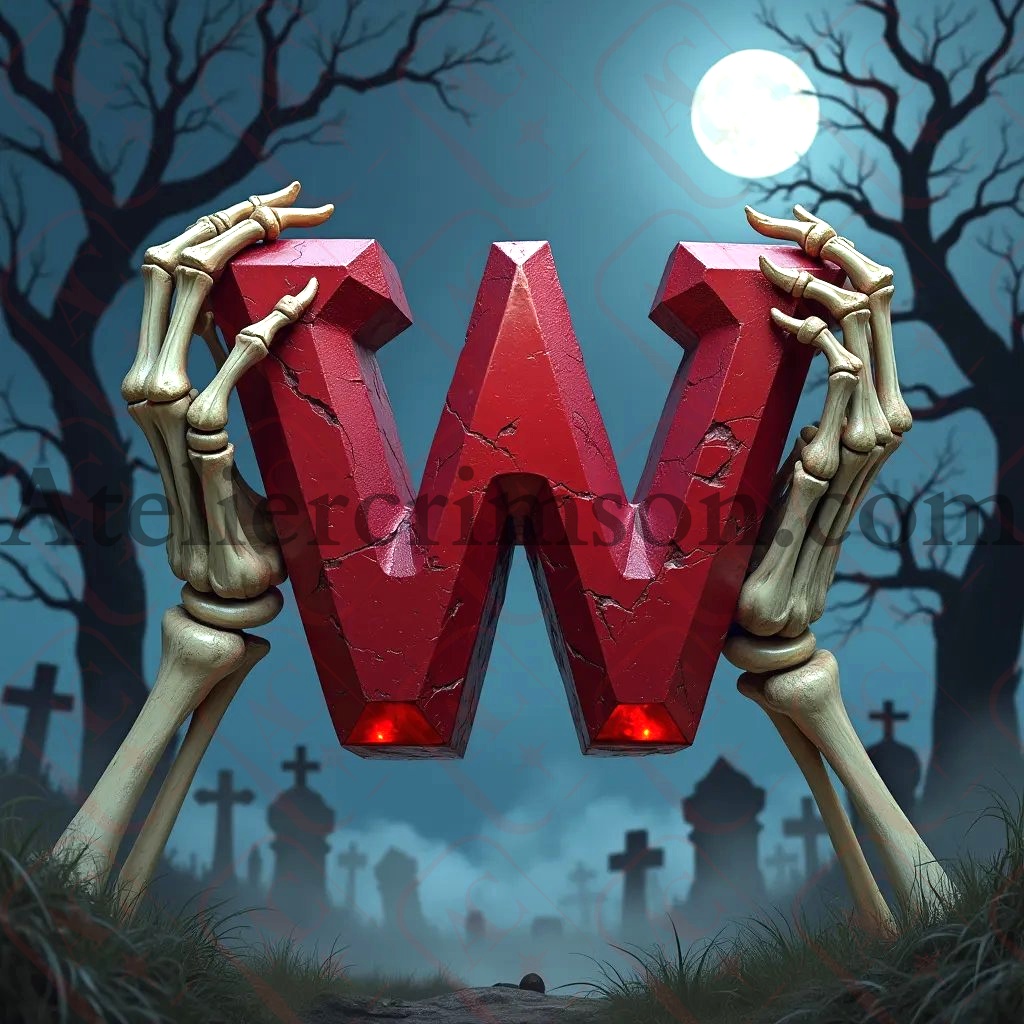 The letter W ruby halloween skull Discover our eerie alphabet series featuring photorealistic ruby letters and numbers. Each character, crafted from deep red gemstone, floats mysteriously in a misty graveyard. Skeletal hands frame these gleaming symbols against a moonlit, Halloween-inspired backdrop. Perfect for gothic design projects or seasonal decor inspiration!