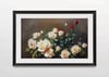The white and off-white flowers in the bunch are expertly rendered with artistic strokes in painterly style. The painting captures the delicate beauty of the roses, showcasing their intricate structure and velvety texture.