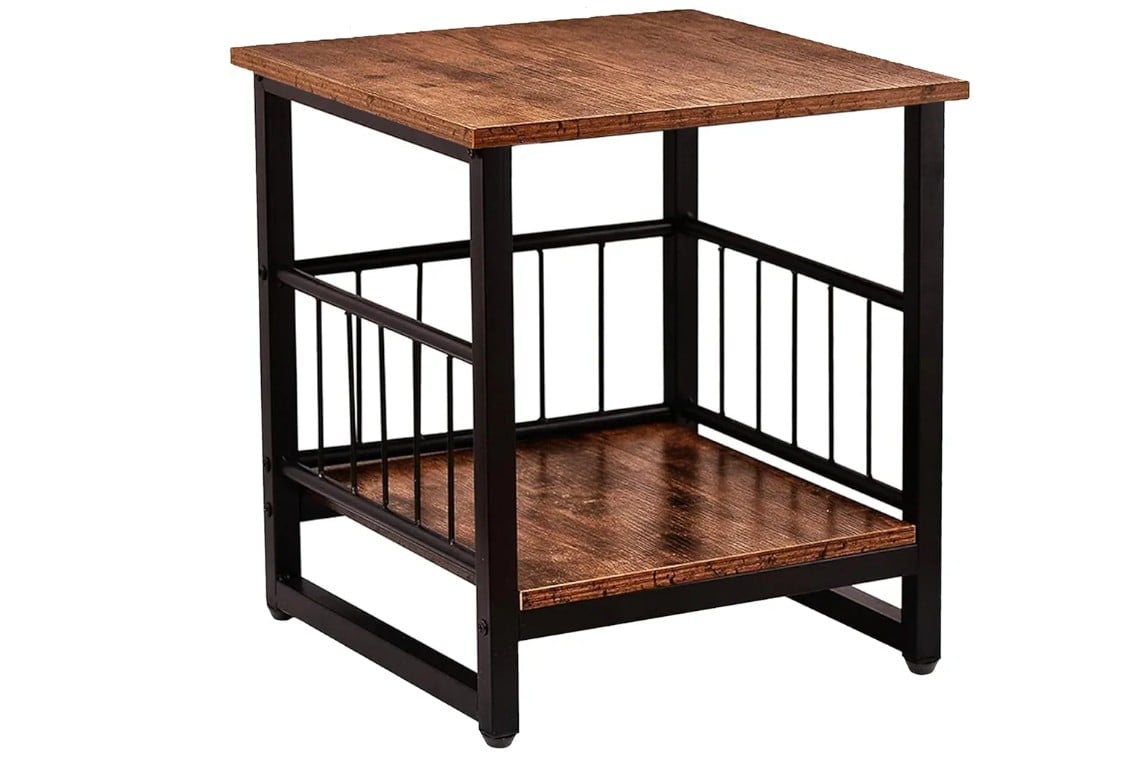 End Table, Industrial Side Table with 2-Tire Storage Shelf, 180LBS Mini Fridge Stand with Adjustable Feet, 18"x18" Wood Night Stand Small Bedside Table with Sturdy Metal Frame for Living Room Bedroom