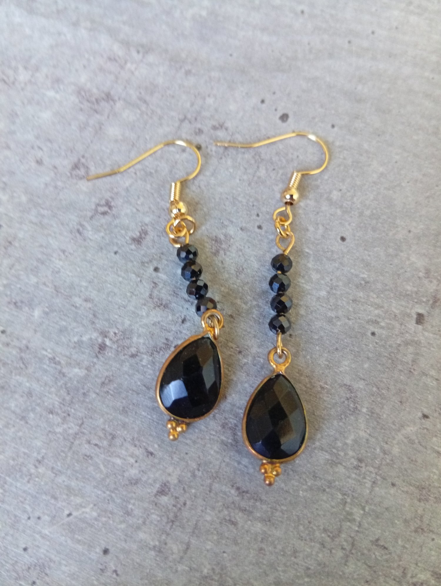 Boucles d’oreilles élégantes en onyx noir facetté, finition dorée, ornées d’une goutte sertie et de perles rondes scintillantes. Leur allure raffinée et protectrice en fait un bijou à la fois sobre et puissant.