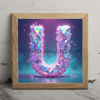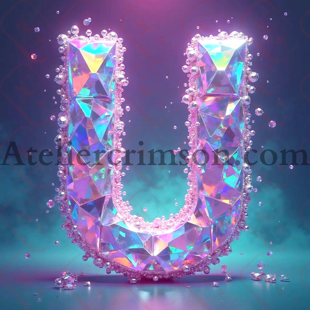 The letter U crystalline Retro Futuristic C A unique creation blending retro-futuristic aesthetics and geometric elegance. Each character is sculpted from iridescent crystals in vibrant, nostalgic hues, set in delicate silver filigree. Against a gradient background transitioning from deep purple to teal blue, this digital artwork captures the essence of 80s-inspired digital art with a touch of crystalline luxury. Perfect for typography enthusiasts, digital art lovers, and those who appreciate retro-futuristic aesthetics.