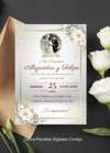 📸 Invitación de Boda Moderna con Flores Blancas, Dorado y Foto de Novios 💛