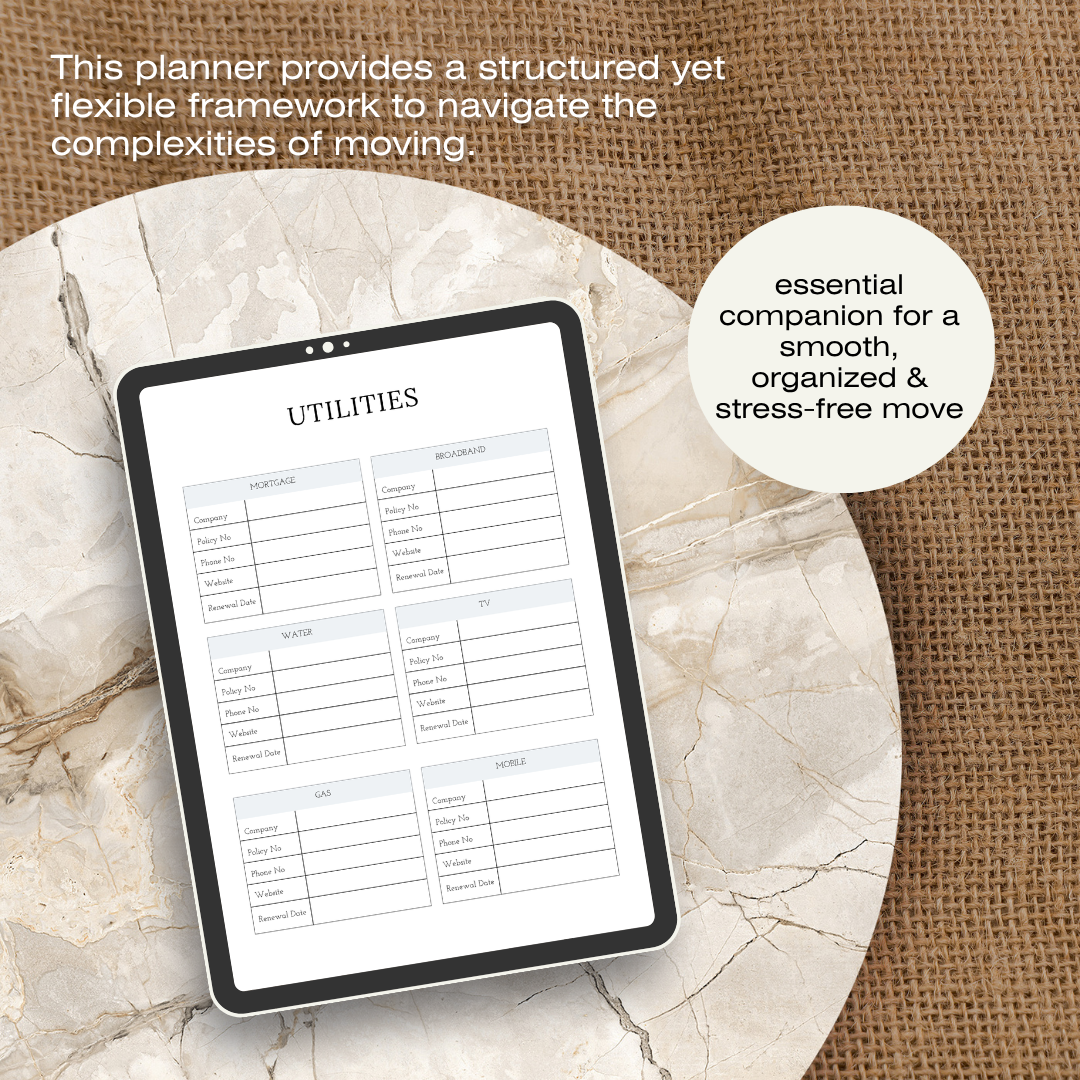 - Change of Address & Utilities: Comprehensive lists for notifying services, government agencies, and personal contacts, along with utility tracking.