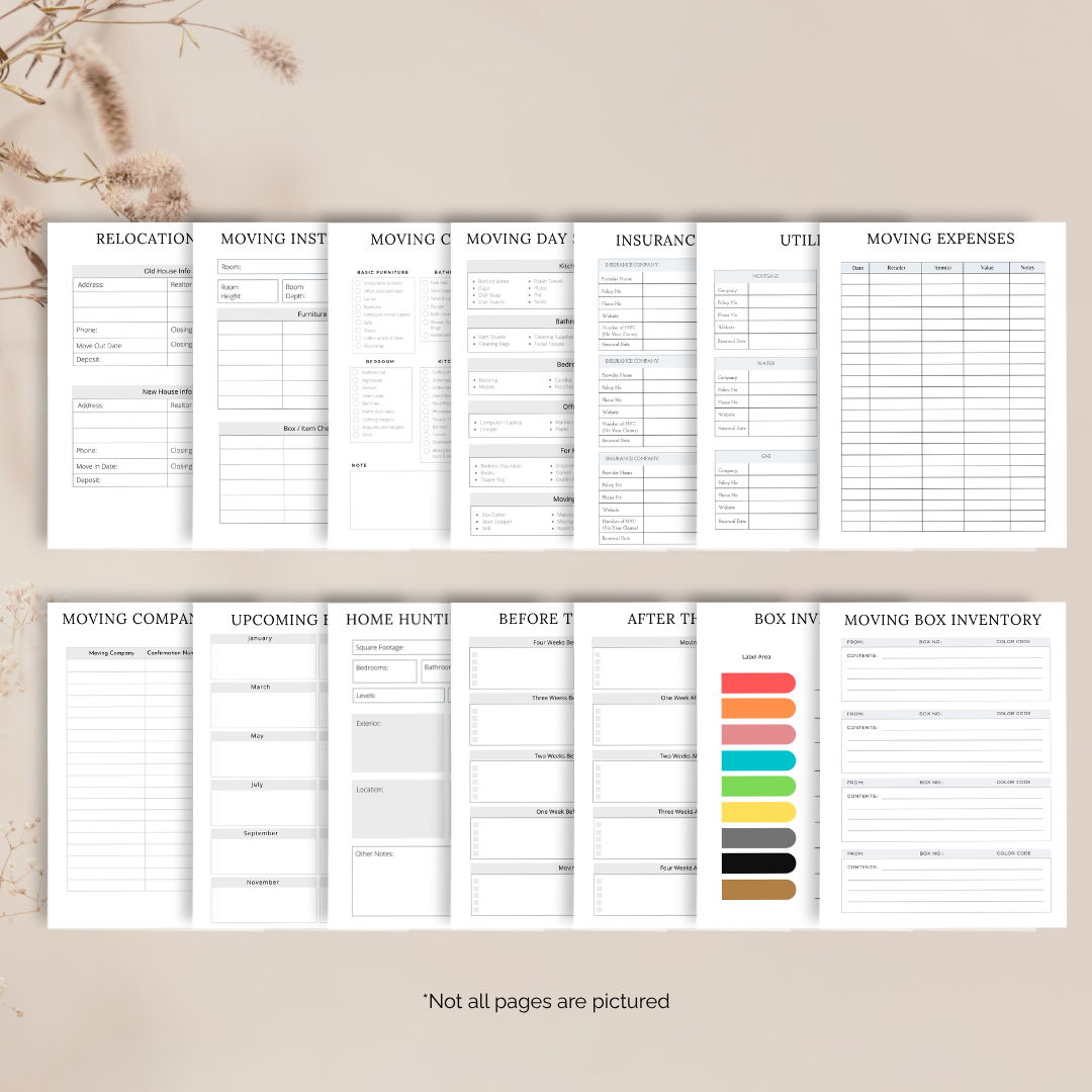 - Moving Day Essentials: Sections for survival kit, moving instructions by room, furniture dimensions, and box/item checklists.