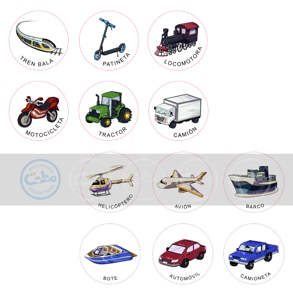 Memorice medios de transporte, 12 medios de transporte 24 fichas en 2 hojas A4. Imprime recorta y enseña jugando.