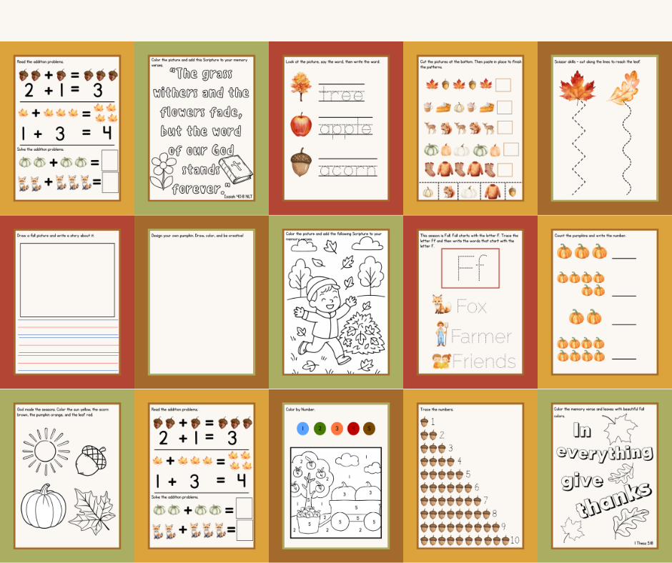 Create a fall filled with beauty, learning, and faith at home. The Grace in Every Season: Fall Learning Pack is a gentle, faith-based resource designed for preschool through early elementary learners. Thoughtfully crafted to nurture both heart and mind, this pack weaves together autumn fun with foundational skills, scripture, and hands-on activities that invite children to see God’s goodness in every season.