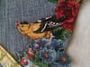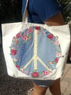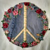 Upcycle denim patch features broderie perse (fabric collage) wreath border and tapestry ribbon Peace Sign. 4 page pattern includes photo illustrations, design tips, and instructions for cutting circular denim patch from a pair of jeans. Suitable for beginners. Large 14" patch can be sewn or glued for use on jackets, bags, cushions, curtains....anywhere.