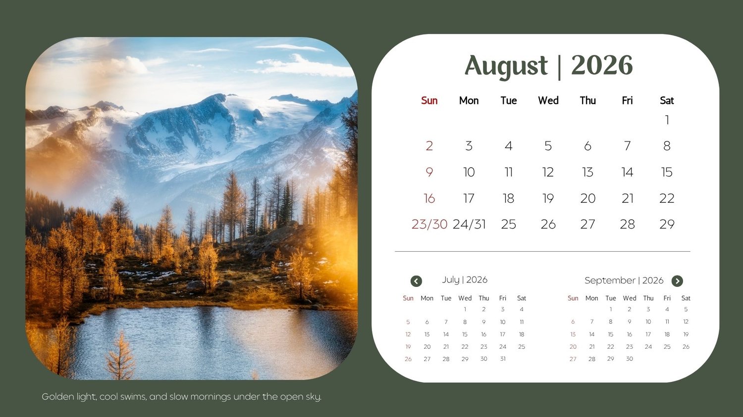 Each month includes an original caption that reflects the mood of the season, inviting you to slow down, explore, and stay inspired all year long.