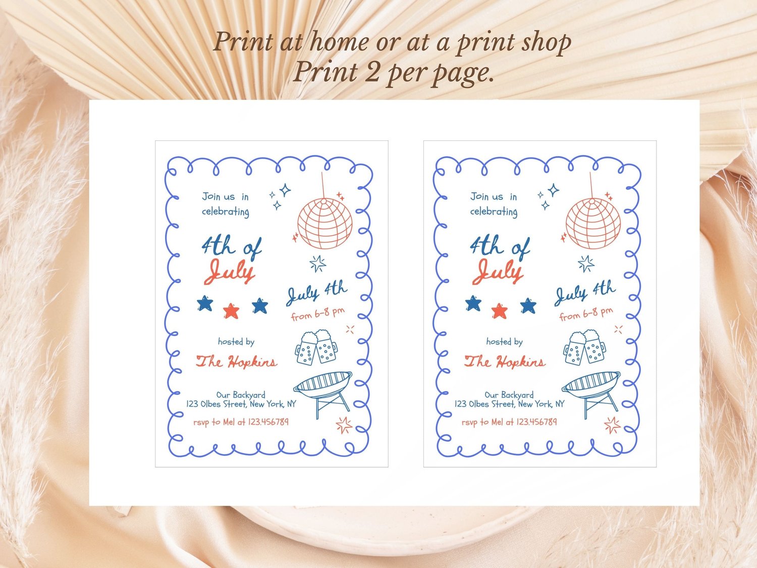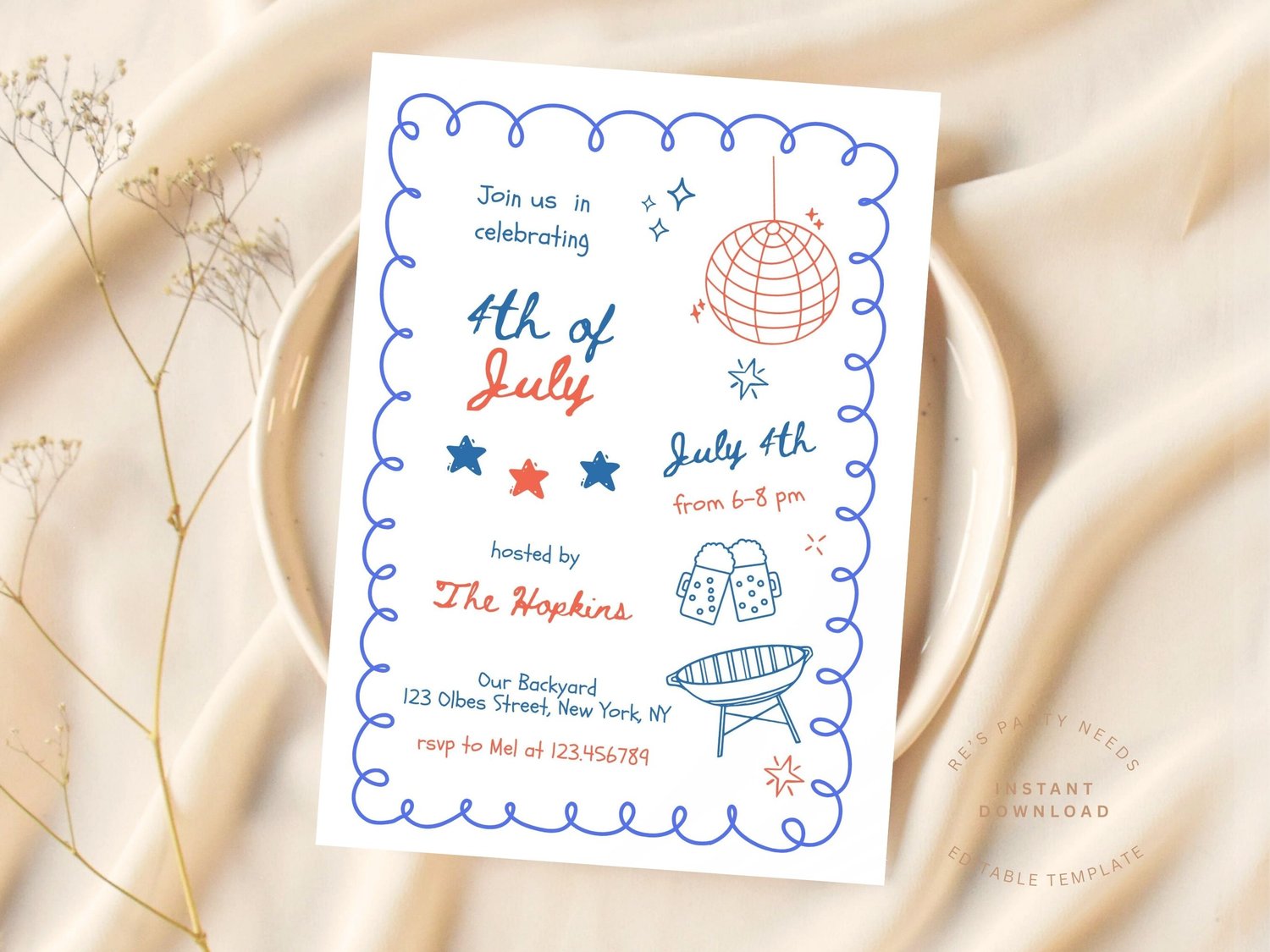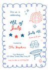 Throw the ultimate patriotic bash with this retro-inspired 4th of July invitation! Featuring a fun hand drawn scribble illustrations of disco balls, cold beers, and backyard grill vibes.