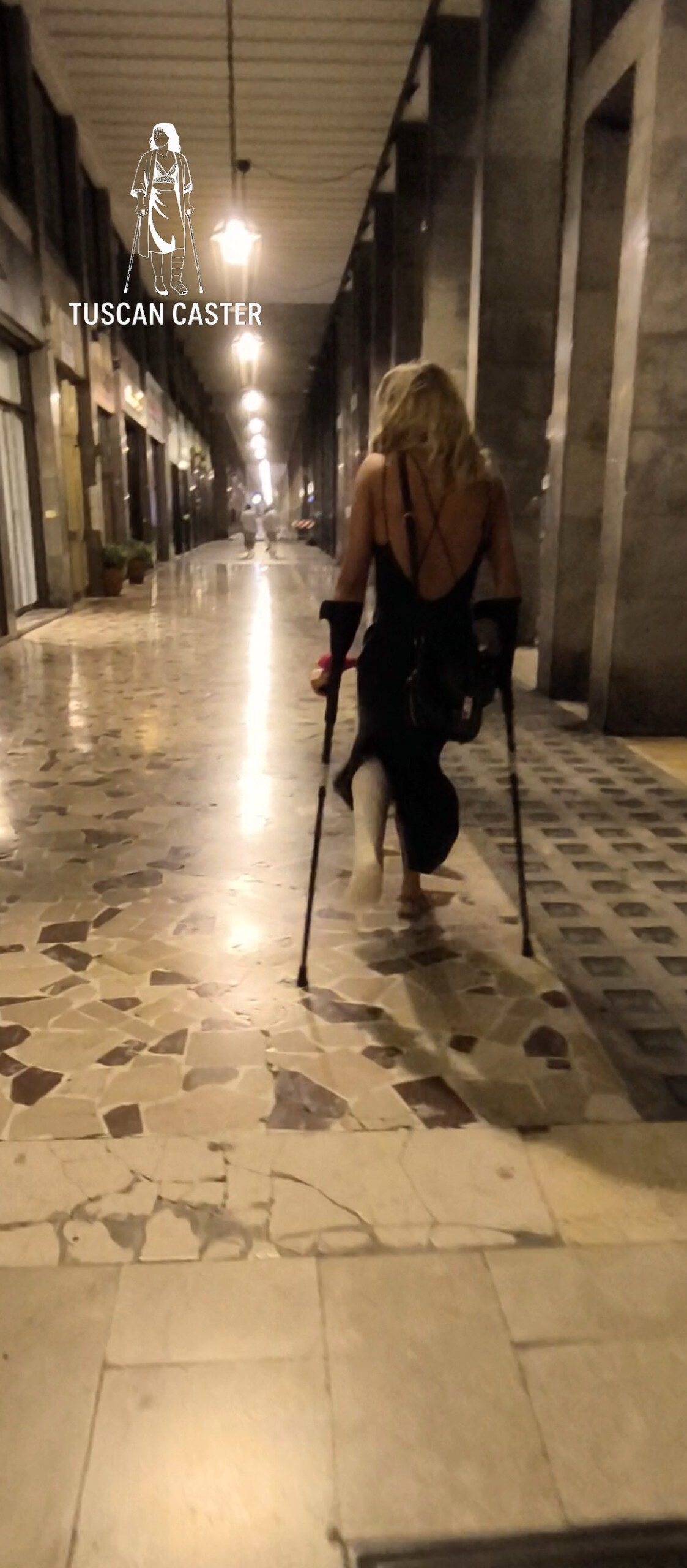 The stunning model Noemi returns to captivate in an unforgettable night walk through the historic streets of Livorno. Dressed in an elegant and sexy black outfit, highlighted by the striking presence of an SLC Plaster cast, every step turns heads.