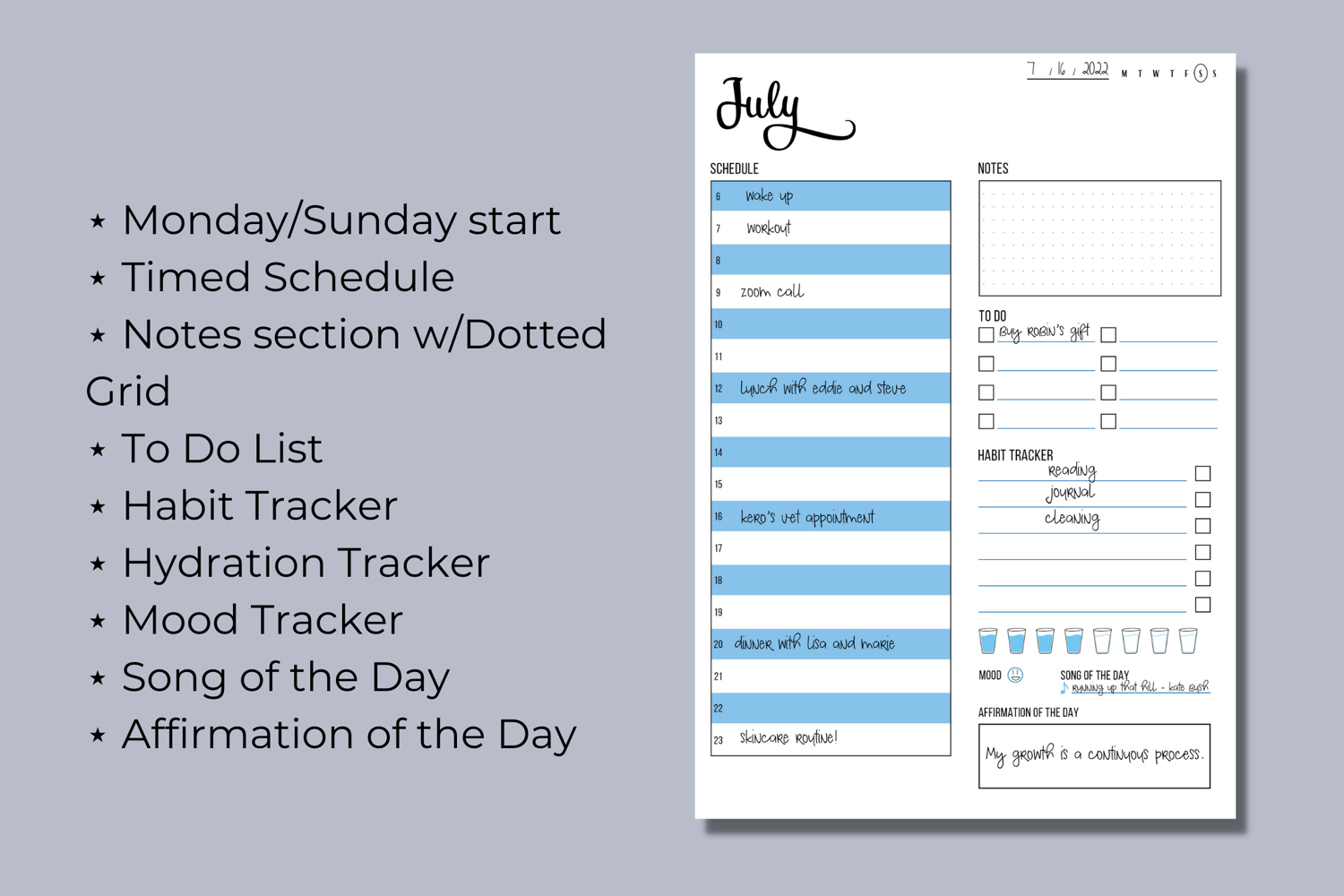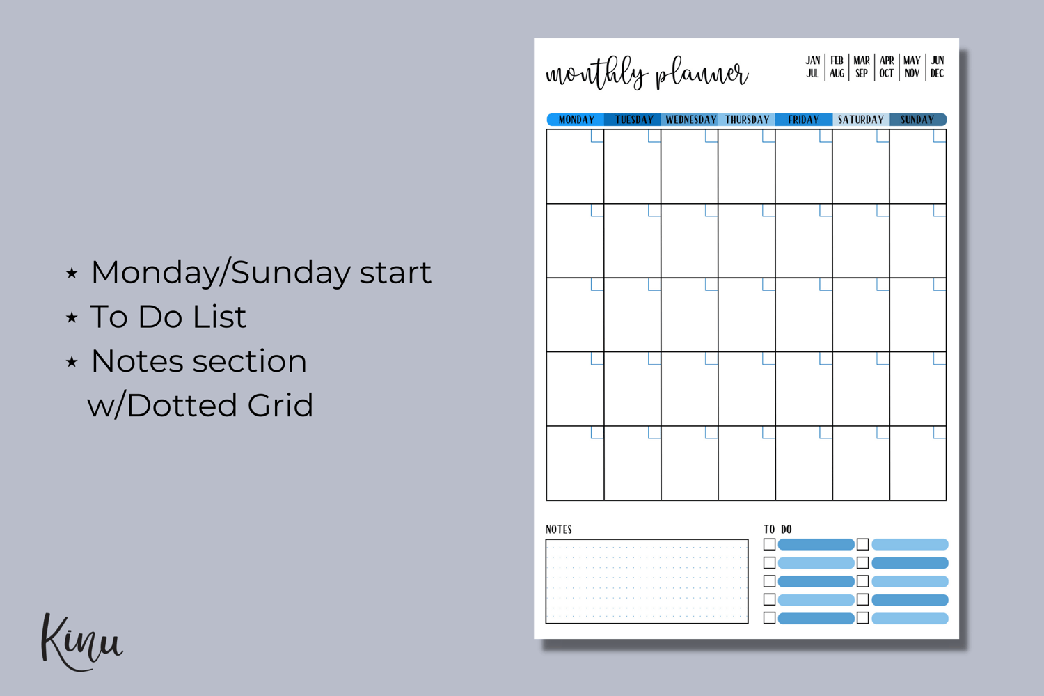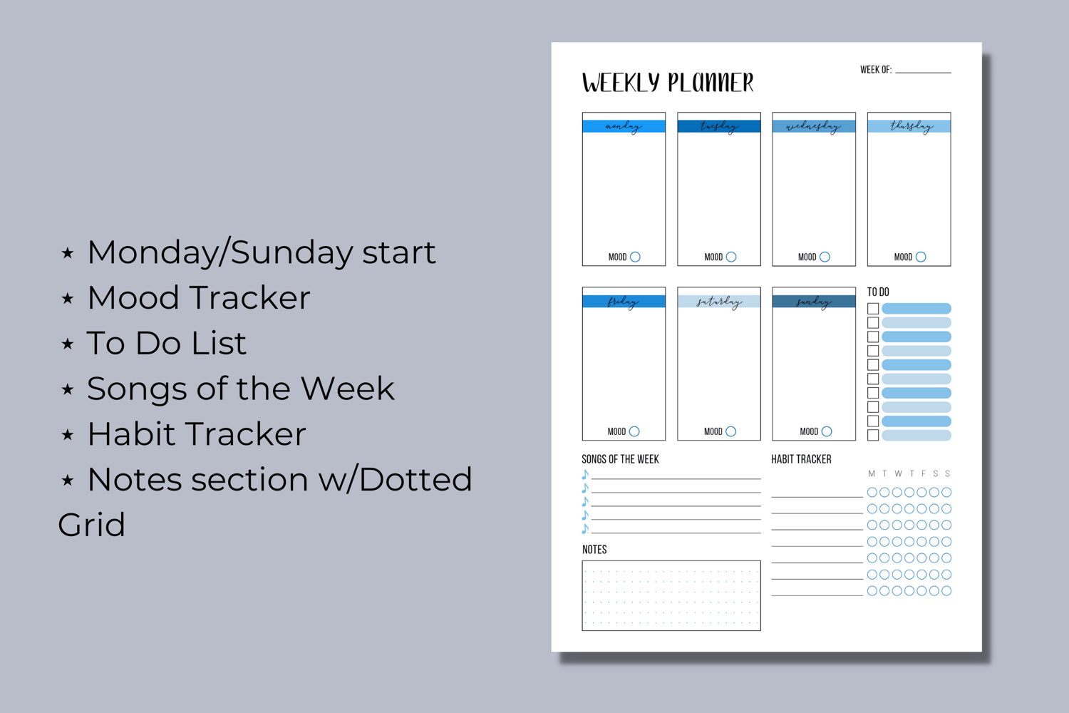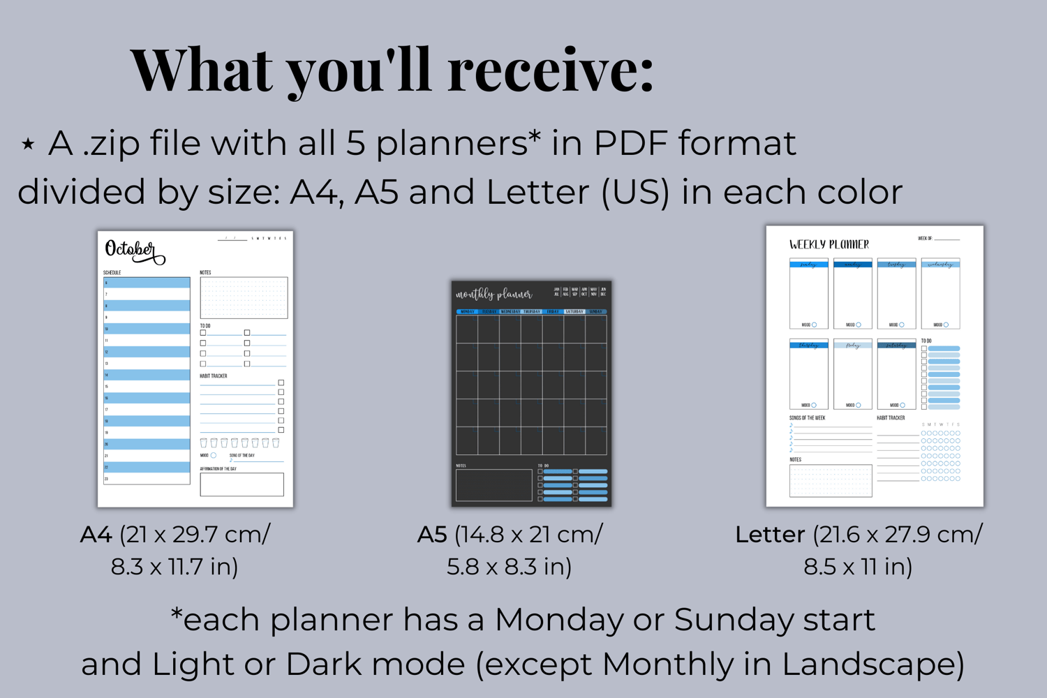 As this is a digital download, no physical product will be mailed to you. You'll receive one ZIP file containing the five planners in the color blue in PDF files that include the following: