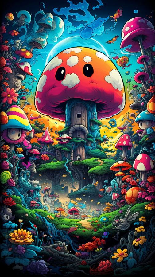 In this whimsical scene, the mushroom landscape takes center stage, captivating your imagination with its vibrant colors and intricate details. Each mushroom seems to hold its secrets, whispering tales of mystery and charm. The mushroom house, nestled on the hill, adds an element of magic and invites you to explore the hidden wonders that lie within.