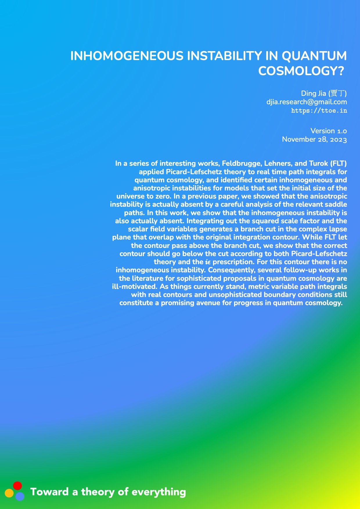 Abstract: In a series of interesting works, Feldbrugge, Lehners, and Turok (FLT) applied Picard-Lefschetz theory to real time path integrals for quantum cosmology, and identified certain inhomogeneous and anisotropic instabilities for models that set the initial size of the universe to zero. In a previous paper, we showed that the anisotropic instability is actually absent by a careful analysis of the relevant saddle paths. In this work, we show that the inhomogeneous instability is also actually absent. Integrating out the squared scale factor and the scalar field variables generates a branch cut in the complex lapse plane that overlap with the original integration contour. While FLT let the contour pass above the branch cut, we show that the correct contour should go below the cut according to both Picard-Lefschetz theory and the iε prescription. For this contour there is no inhomogeneous instability. Consequently, several follow-up works in the literature for sophisticated proposals in quantum cosmology are ill-motivated. As things currently stand, metric variable path integrals with real contours and unsophisticated boundary conditions still constitute a promising avenue for progress in quantum cosmology.