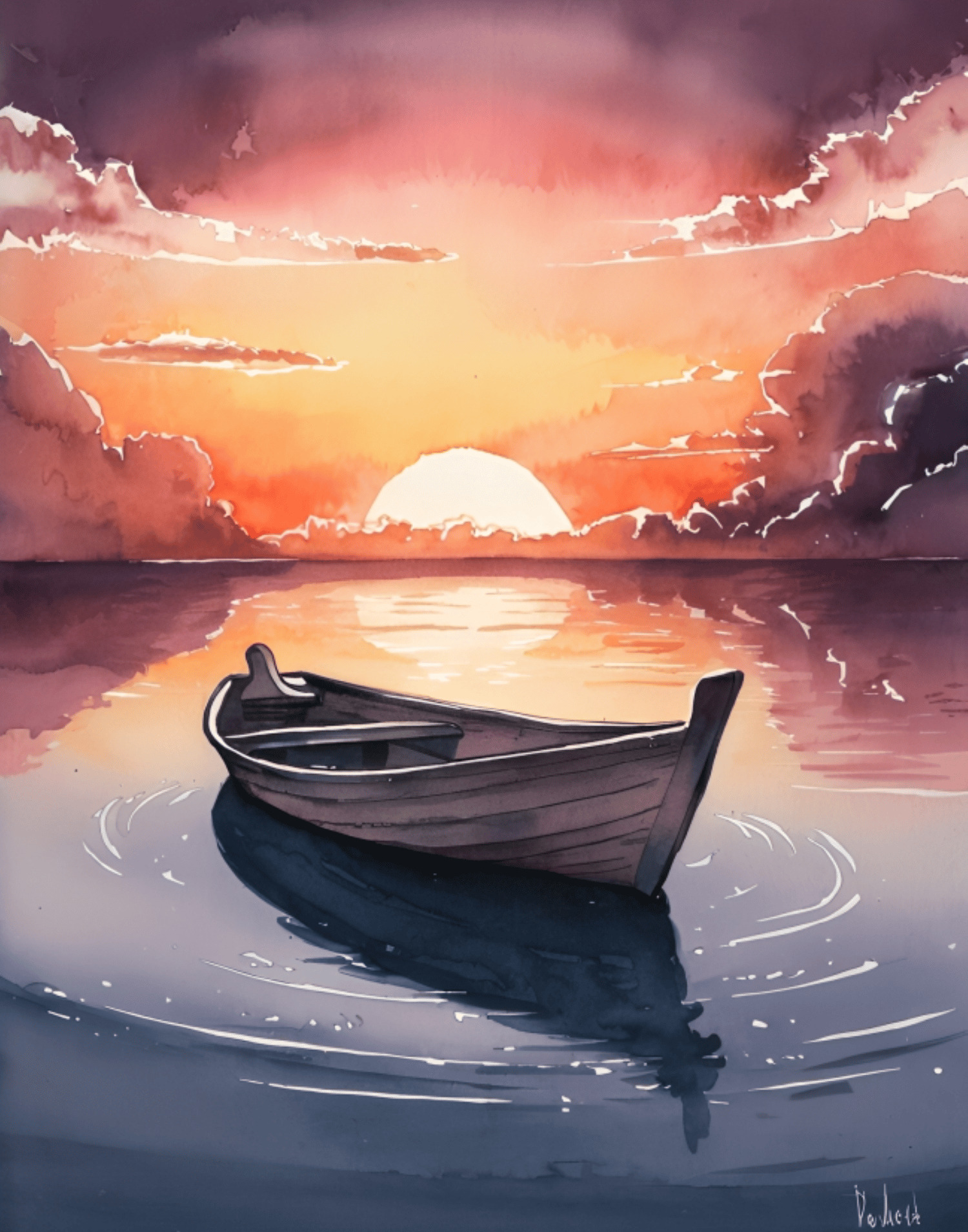 Vintage Boat, Single Boat, Calm Sea Sunset, Top Art, Painting.