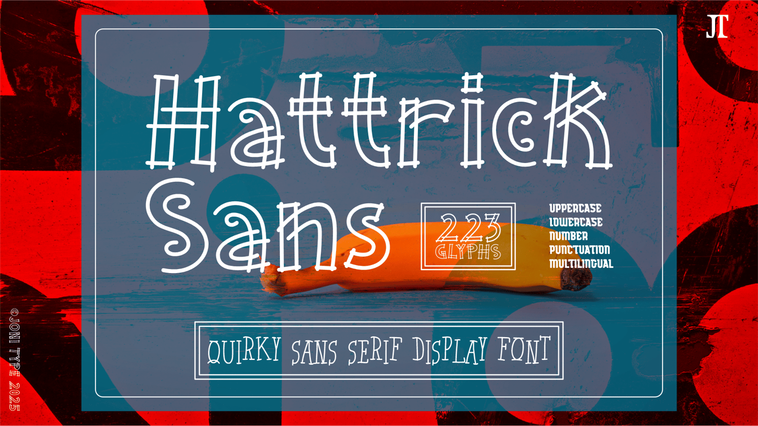 Hattrick Sans is a quirky sans-serif display font packed with personality and creativity. Its playful, hand-drawn strokes and experimental letterforms make it stand out while remaining clean and legible.
