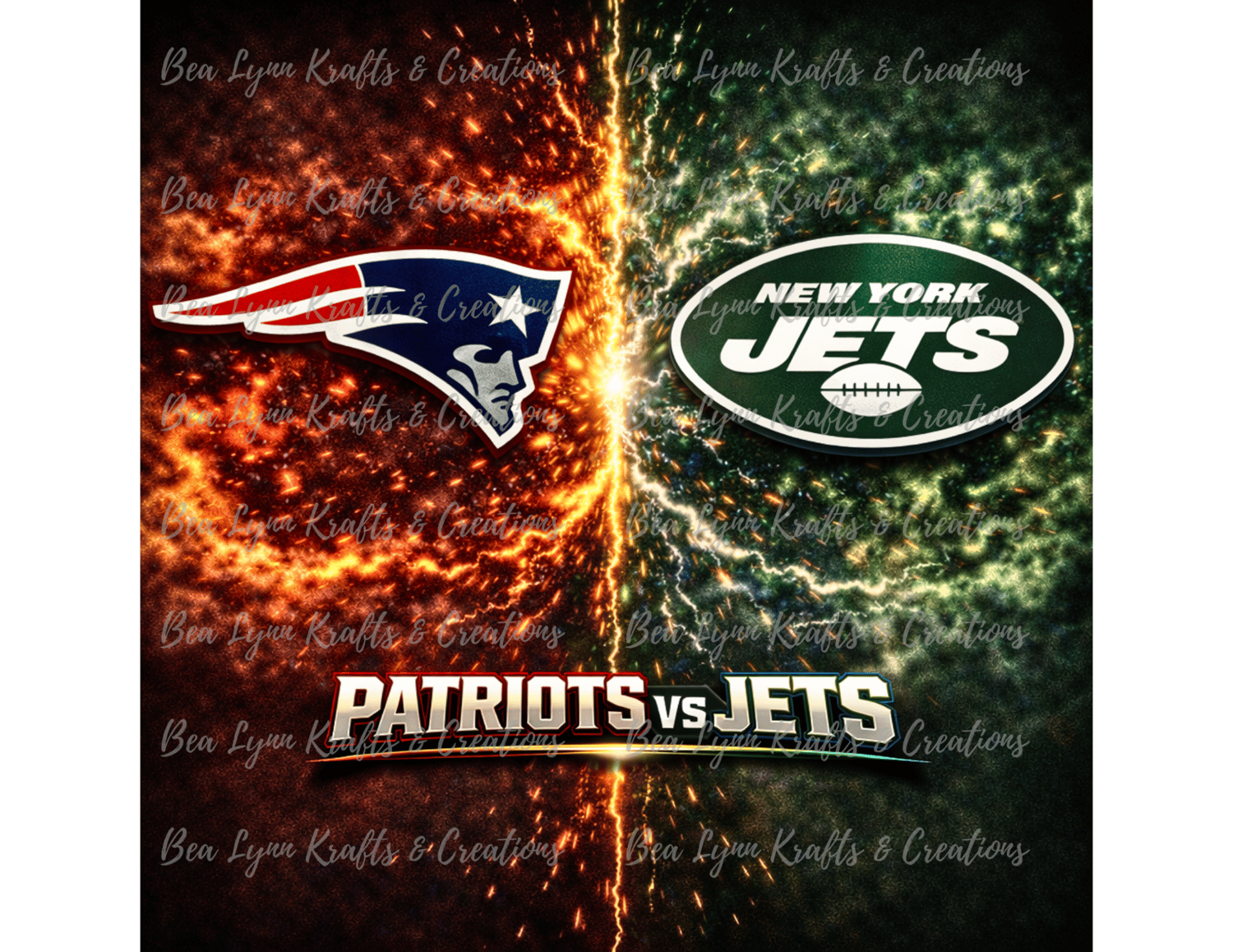 High-resolution Patriots vs Jets matchup PNG featuring a fiery red-vs-green split lightning design. Perfect transparent PNG for sublimation, shirts, tumblers, stickers, and game-day crafts. Ideal for rivalry merch and football fan projects.