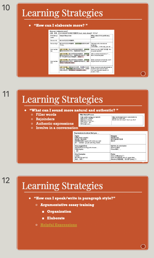 - 目标可视化,家长秒懂高阶要求:对照 ACTFL “中级中” 标准,用具体示例(如 “用条件句扩展观点”“个性化表达”)拆解目标,搭配口语 / 写作案例,家长一看就懂孩子要达到 “能写议论文、自然对话” 的高阶水平。