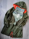 The cowl is knitted from bottom up in mosaic technique, casting on three stitches and increasing at the beginning and end of each right side row. On the right-side of the cowl, the main colour appears in stockinette stitch, whereas the contrasting colour appears in garter stitch. After completing the flap, stitches are cast on for the back of the neck and joined for knitting in the round.