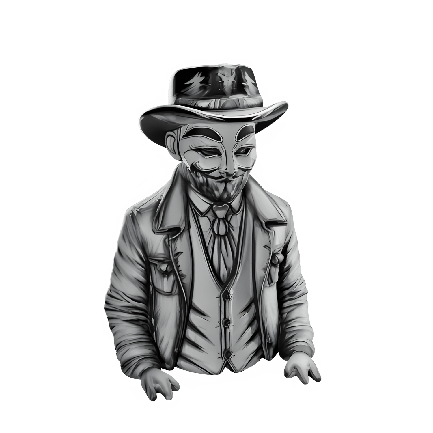 - A mysterious figure wearing a wide-brimmed hat and mask, reminiscent of the Anonymous/Guy Fawkes aesthetic