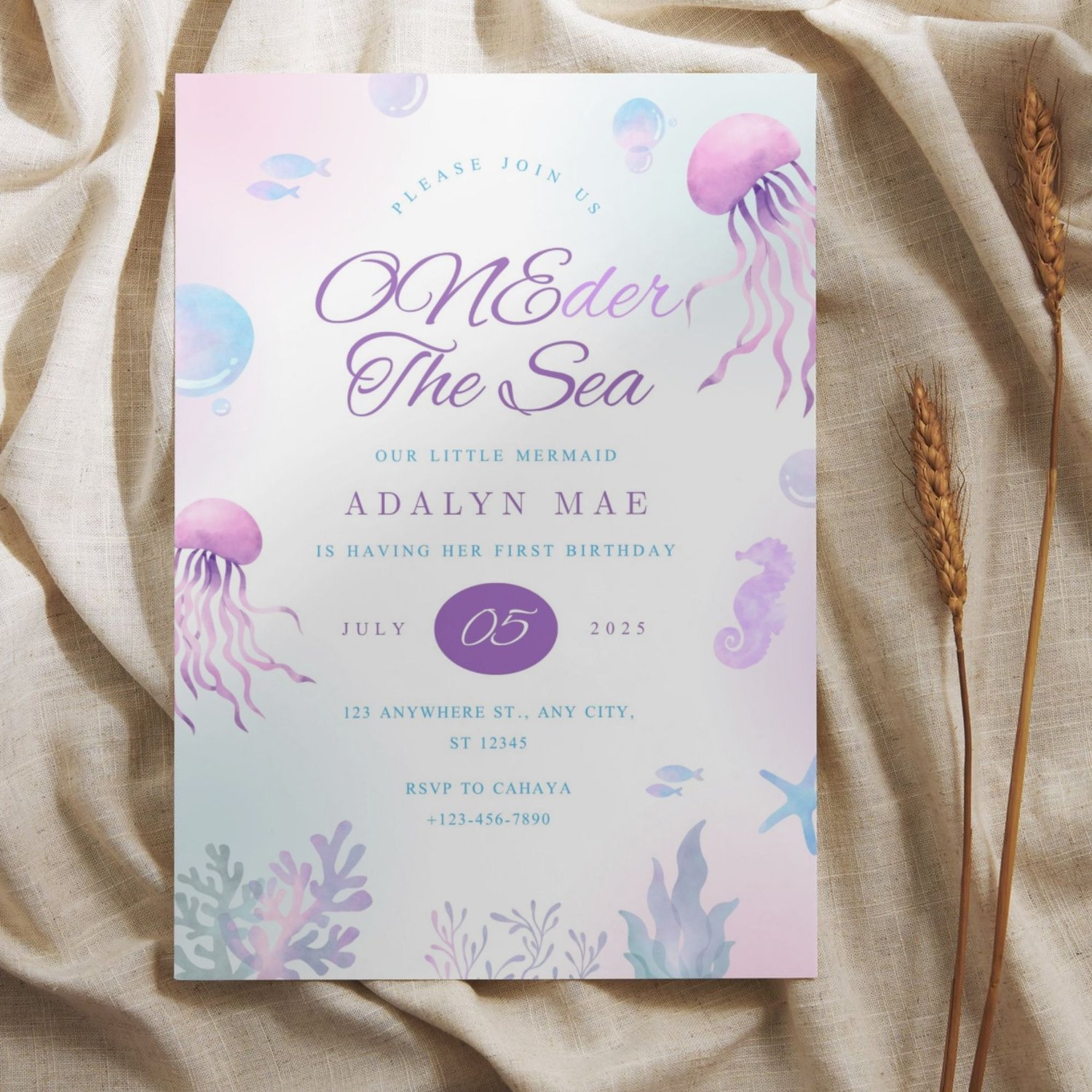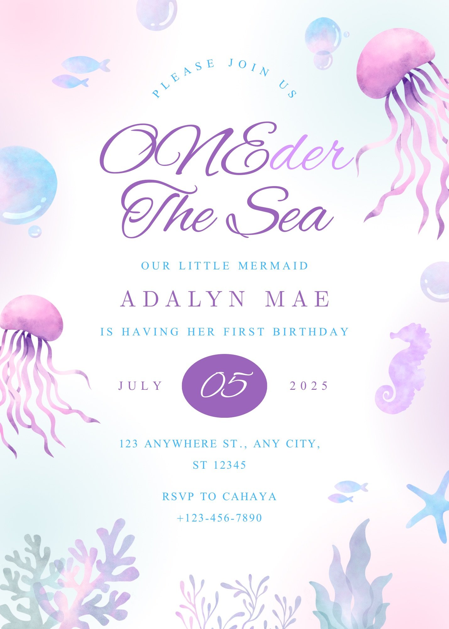 Perfect for your little mermaid’s 1st birthday, this pastel sea-themed template is editable and instantly downloadable. Just personalize, print or send digitally!