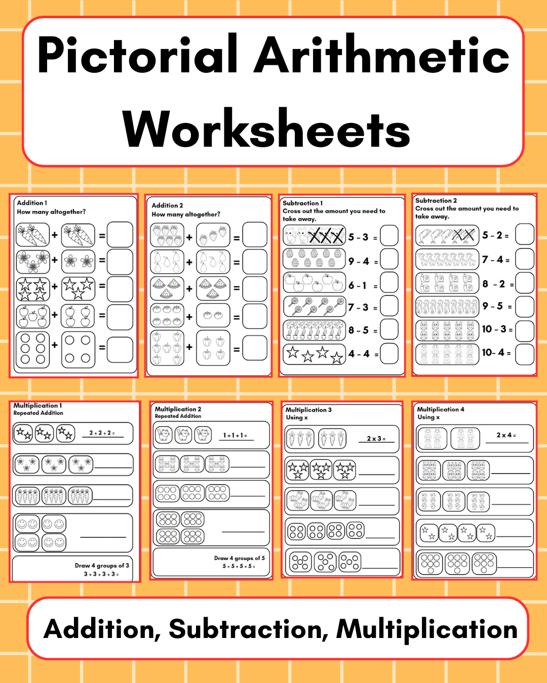 Pictorial Arithmetic Worksheets - Addition, Subtraction, Multiplication