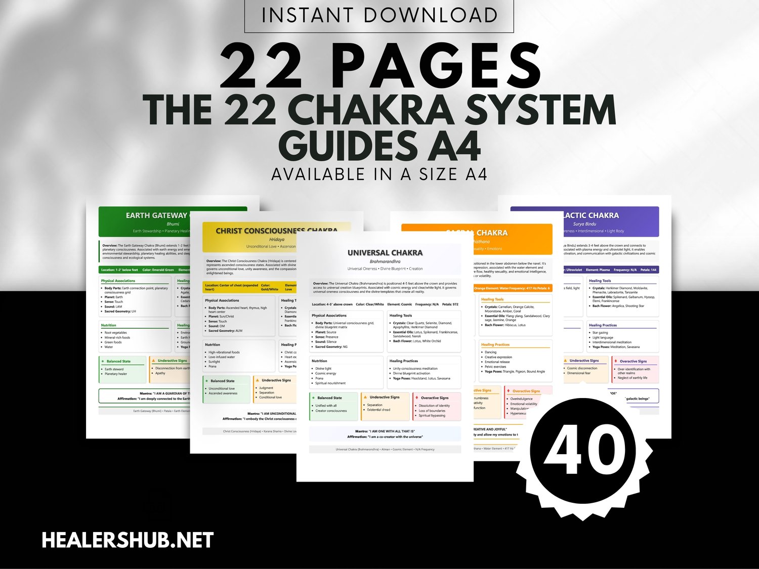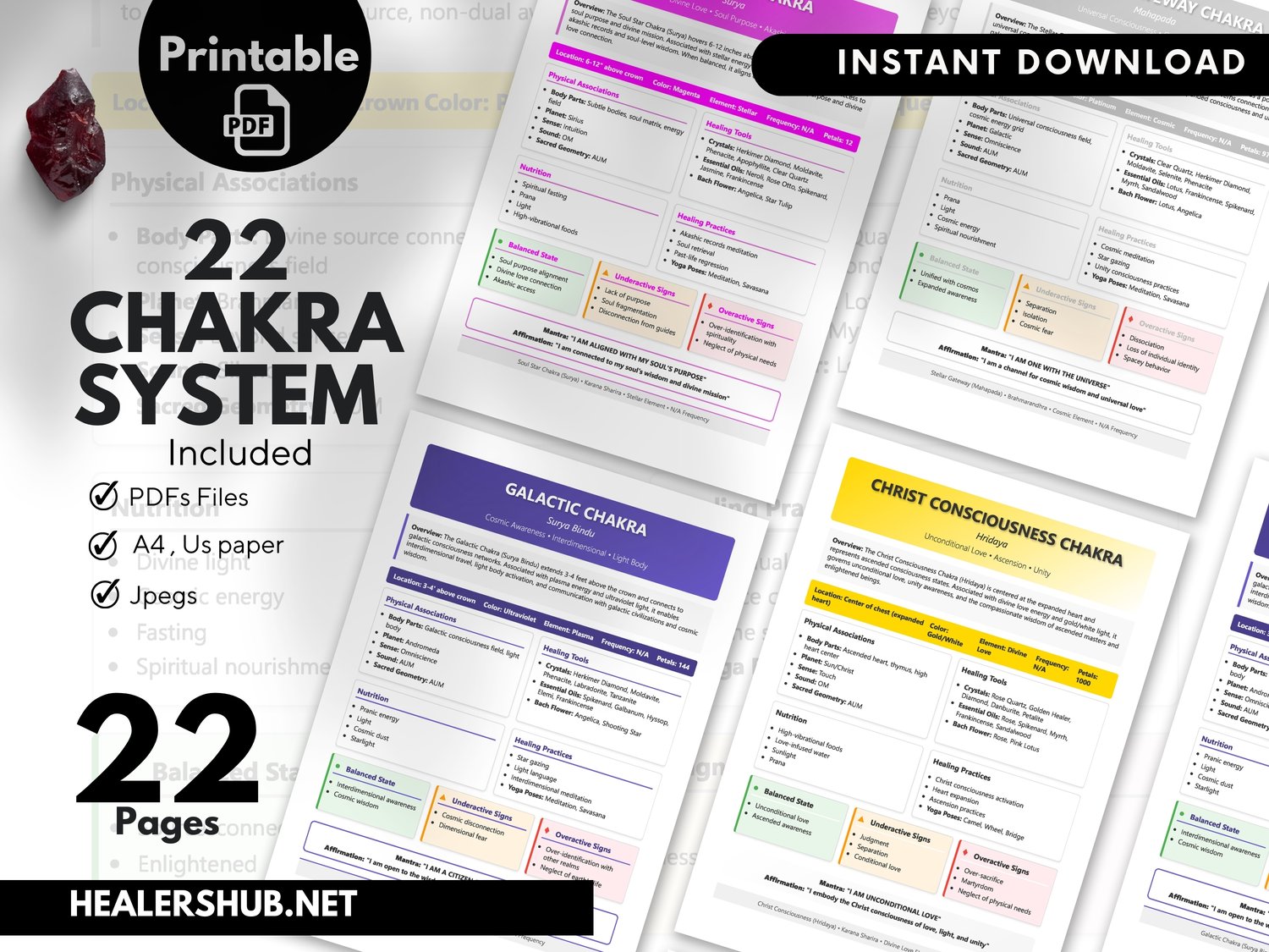 The full spectrum of your energetic body with our comprehensive 22 Chakra Chart Printable Set. This is the ultimate Chakra Healing Guide for anyone looking to deepen their spiritual practice, from curious beginners to seasoned reiki practitioners.