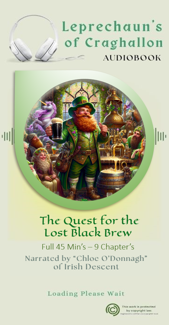 In the leprechaun village of Craghallon, nestled at the edge of the Enchanted Forest, Brewer Gill O'Mara woke up to a shocking discovery. Gill, stout and cheerful with his bushy red beard and ever-askew pointed hat, had always been the proud creator of the Black Stuff—a drink so rich and dark that it sparkled like the midnight sky. But this morning, the barrels of Black Stuff glimmered an unnatural shade of bright blue. "What in the world?" Gill gasped, clutching his brewing ladle as he stared at the barrels. The village square was soon abuzz, leprechauns gathering in their green and brown outfits, their pointed hats bobbing as they muttered in confusion. Queen Siobhan, regal and wise, stepped gracefully into the square, her silver hair glinting in the sunlight. Her ivy crown twinkled as she raised her hands to calm the crowd.