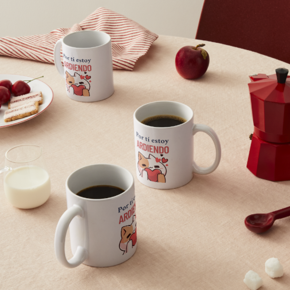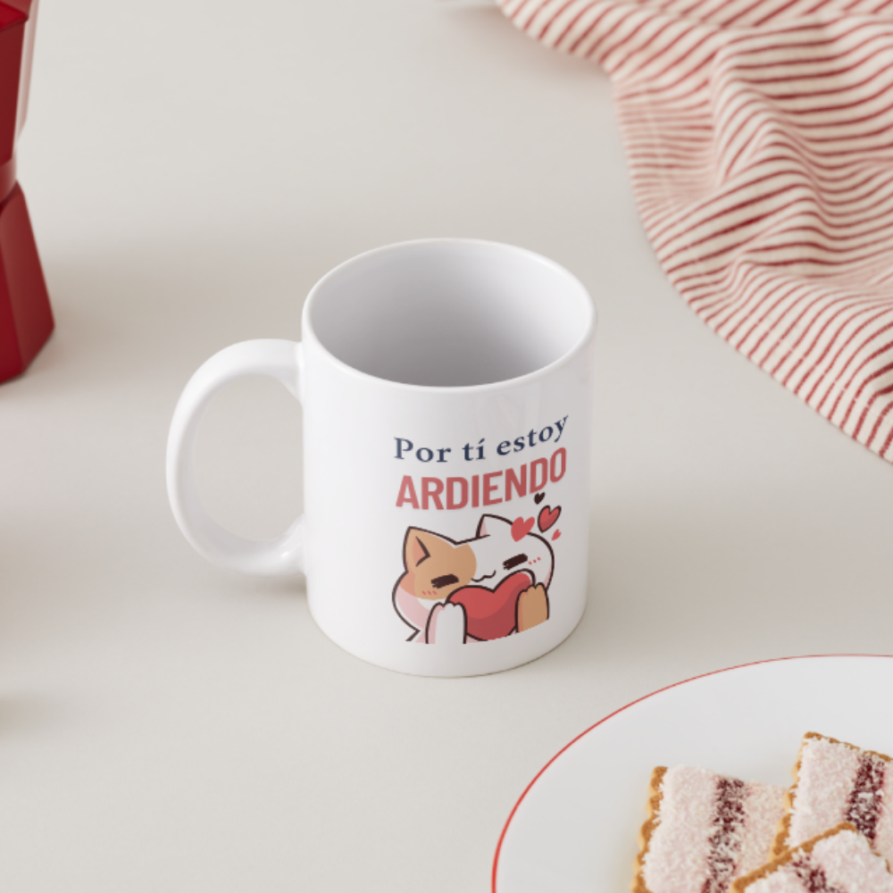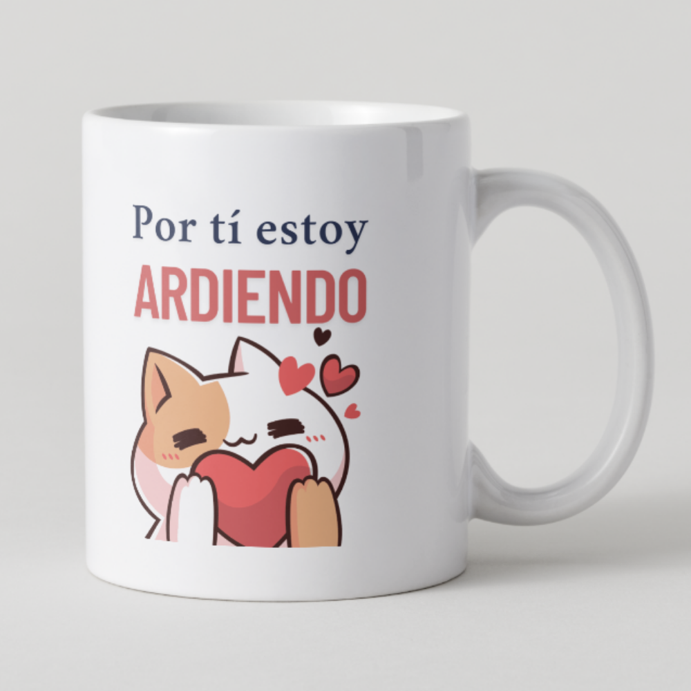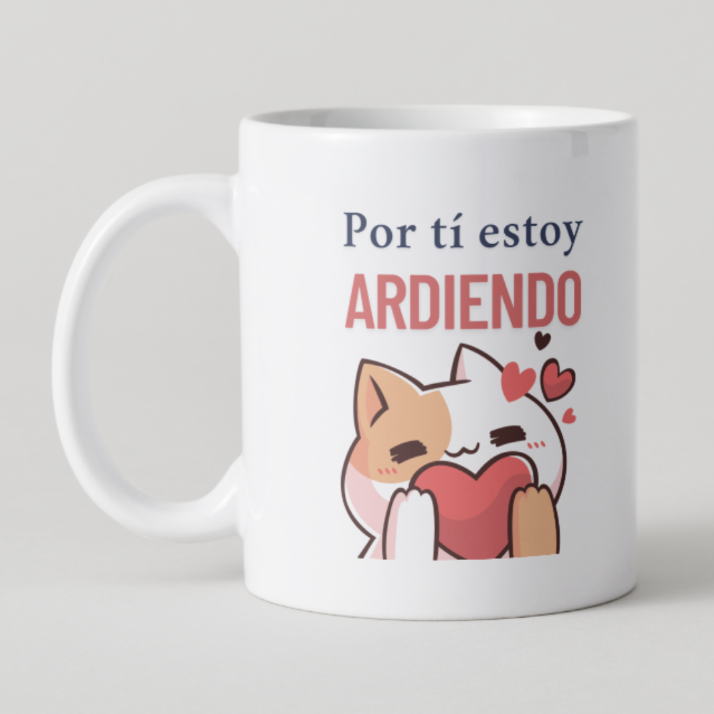 Esta taza presenta a un gatito enamorado abrazando un corazón, acompañado del mensaje “Por ti estoy ARDIENDO”. Un diseño perfecto para regalar a tu crush, tu pareja o a ti mismo en un momento de pasión cafetera.