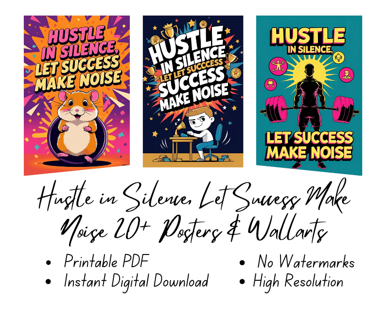 Level up your walls with this exclusive 20+ poster collection, built around the powerful message: “Hustle in Silence, Let Success Make Noise.”