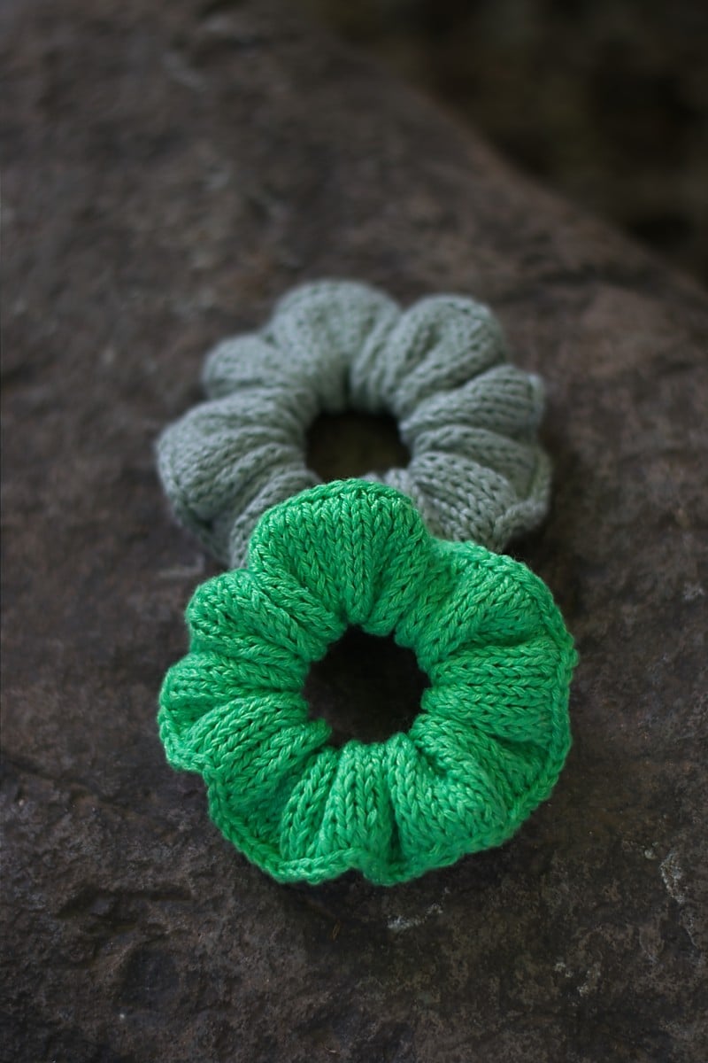 Estrid Scrunchie wird glatt rechts in Runden gearbeitet und da die Maschen mit Judy’s magic cast on angeschlagen werden, muss das Scrunchie am Ende nicht zusammengenäht werden. Die Maschen lassen sich am Ende einfach zusammenstricken.