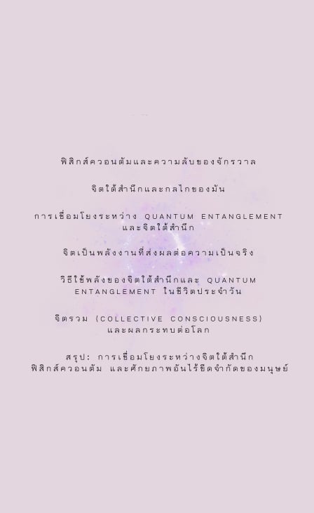 "จิตใต้สำนึกเชื่อมโยงควอนตัม: ไขปริศนาความเป็นจริงและพลังแห่งจิต" เป็นหนังสือที่พาคุณดำดิ่งสู่ขอบเขตอันลึกลับของฟิสิกส์ควอนตัมและจิตสำนึกของมนุษย์ เชื่อมโยงระหว่างวิทยาศาสตร์และจิตวิญญาณอย่างลึกซึ้ง หนังสือเล่มนี้สำรวจแนวคิดของ Quantum Entanglement หรือ ภาวะพัวพันควอนตัม ที่แสดงให้เห็นว่าทุกสรรพสิ่งในจักรวาลอาจเชื่อมโยงกันในระดับที่เหนือกว่าความเข้าใจของเรา นอกจากนี้ ยังเผยให้เห็นถึงพลังอันน่าทึ่งของ จิตใต้สำนึก ที่สามารถกำหนดโชคชะตา เปลี่ยนแปลงชีวิต และสร้างความเป็นจริงที่คุณปรารถนาได้ผ่านการตั้งเจตนาและพลังของความคิด