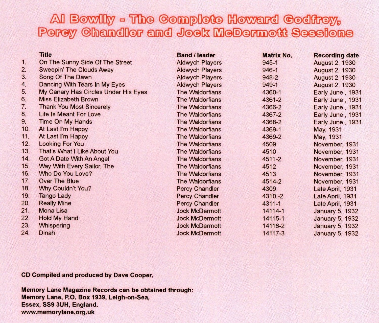 Some really hard to find Al Bowlly titles here, all gathered together in one collection. Many og the original 78s included here are extremely rare and valuable. All remastered from original 78rpms.