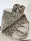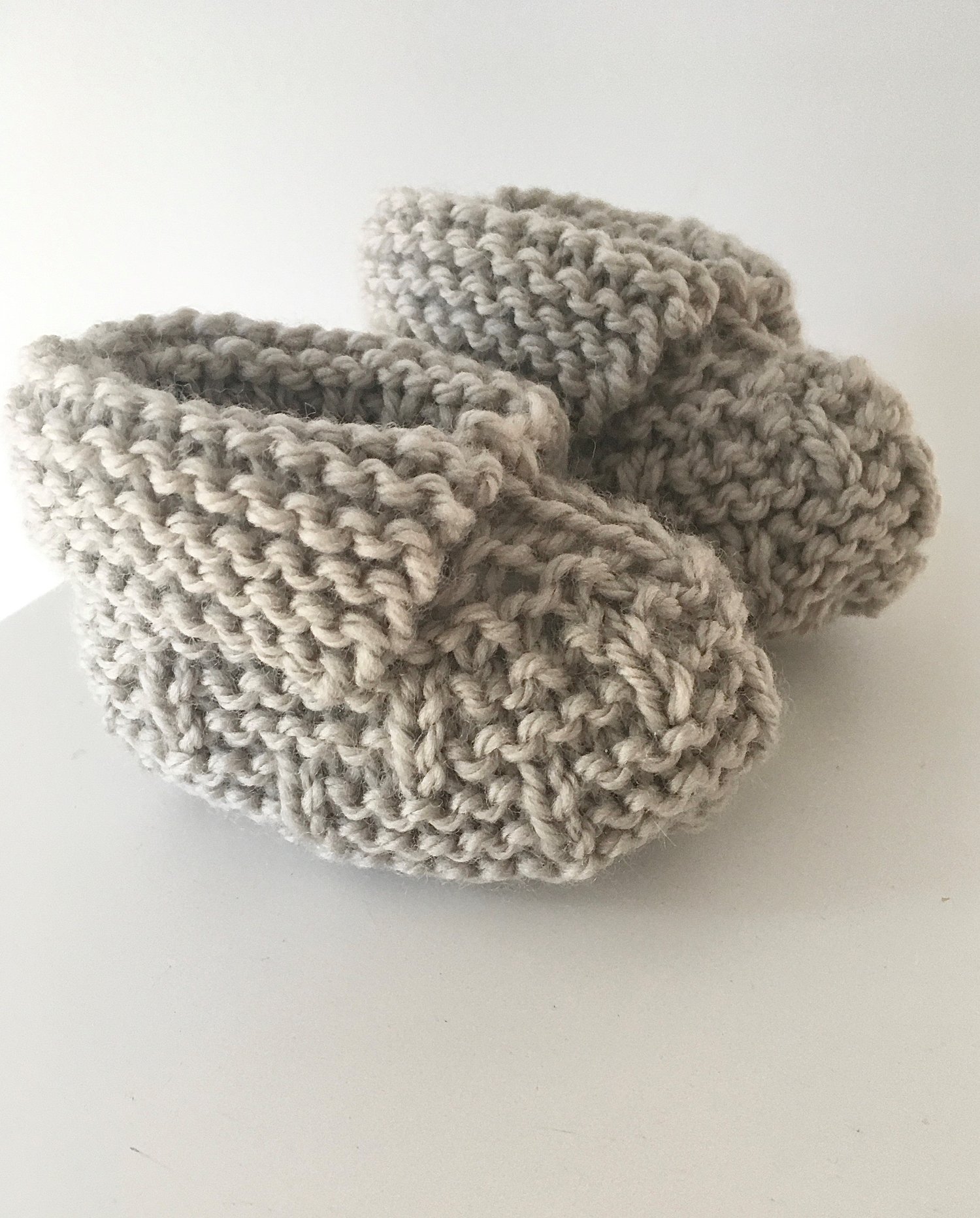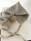 This cute little newborn baby bonnet and booties set is knitted in a thick, cuddly garter stitch background pattern with vertical stocking stitch stripes.