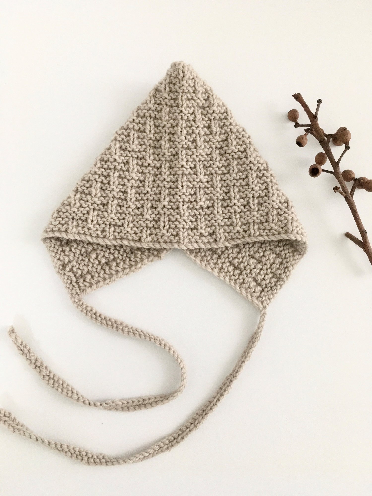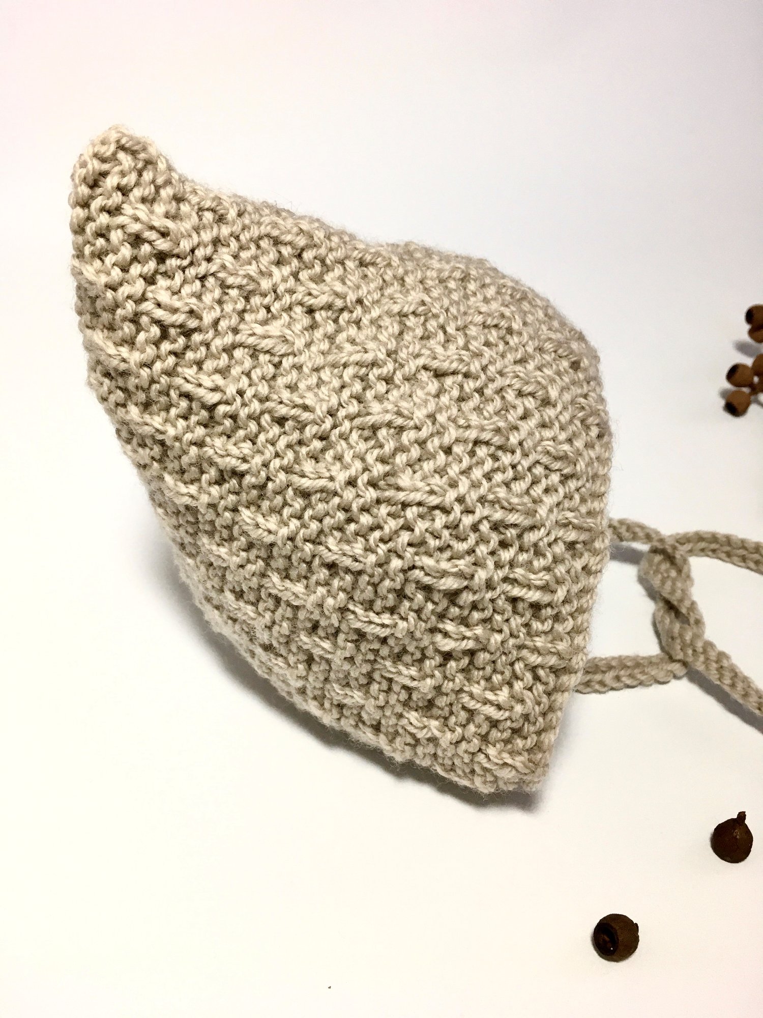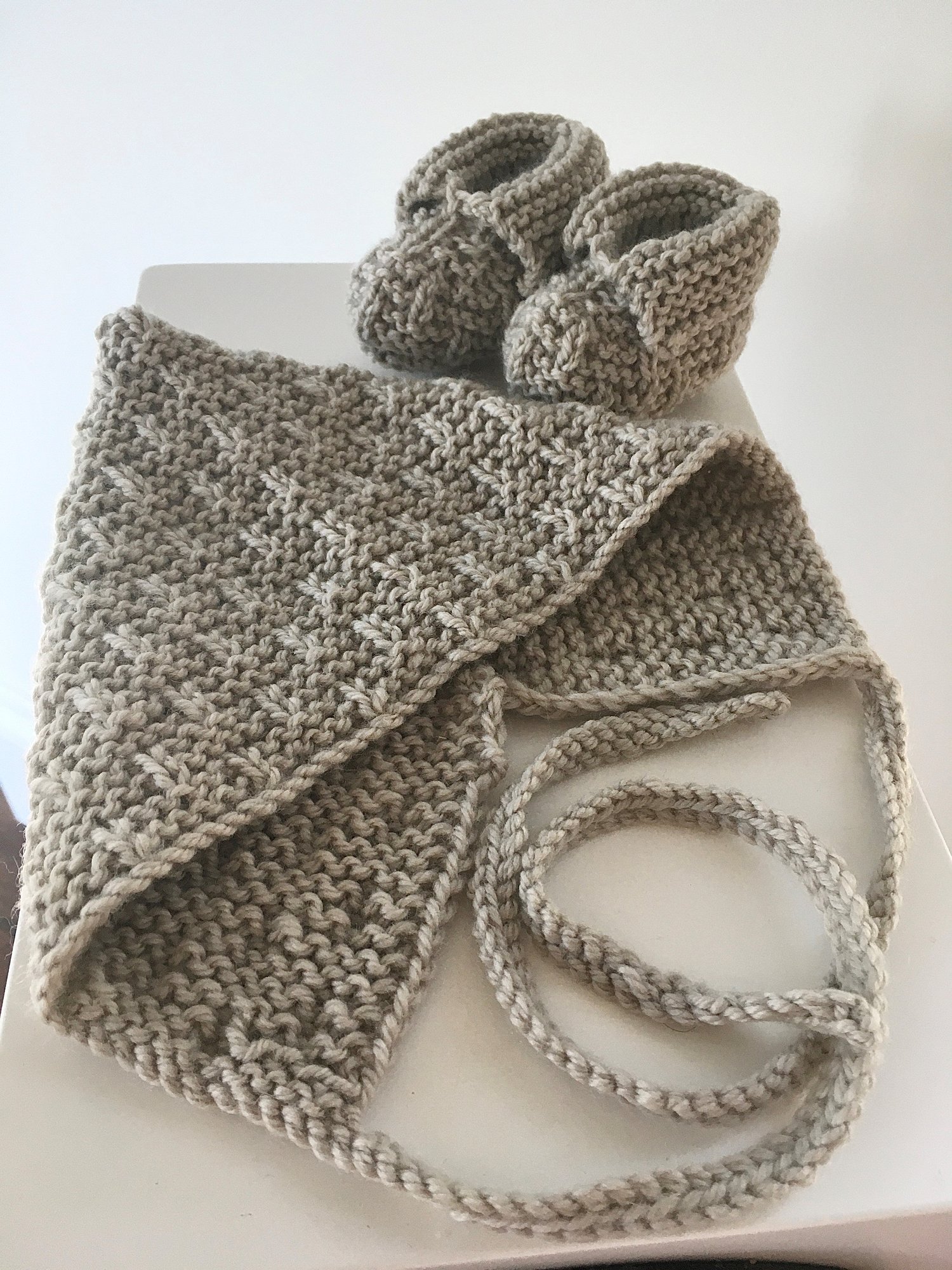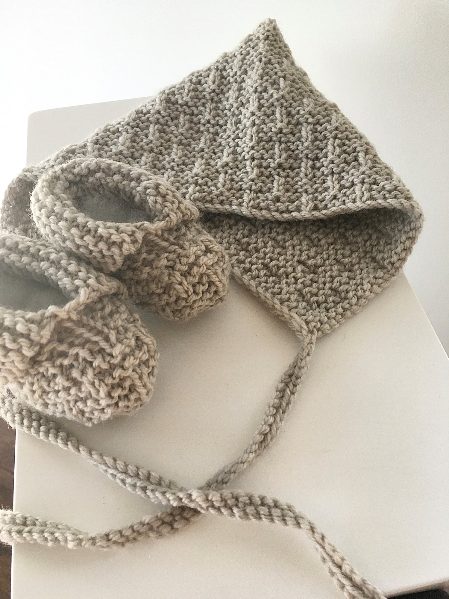 Both the bonnet and booties are knitted flat in one piece and seamed.