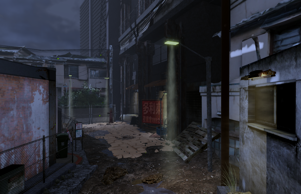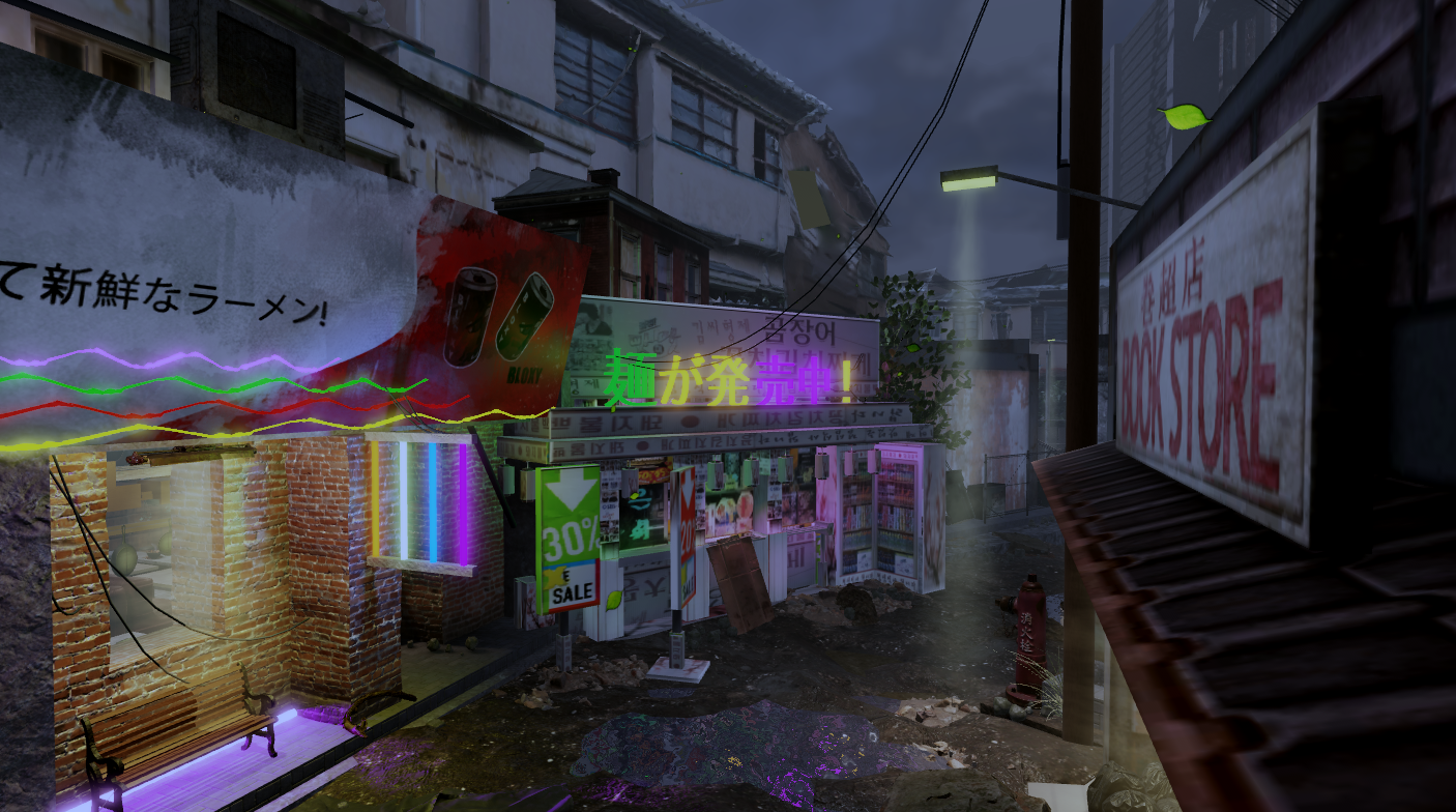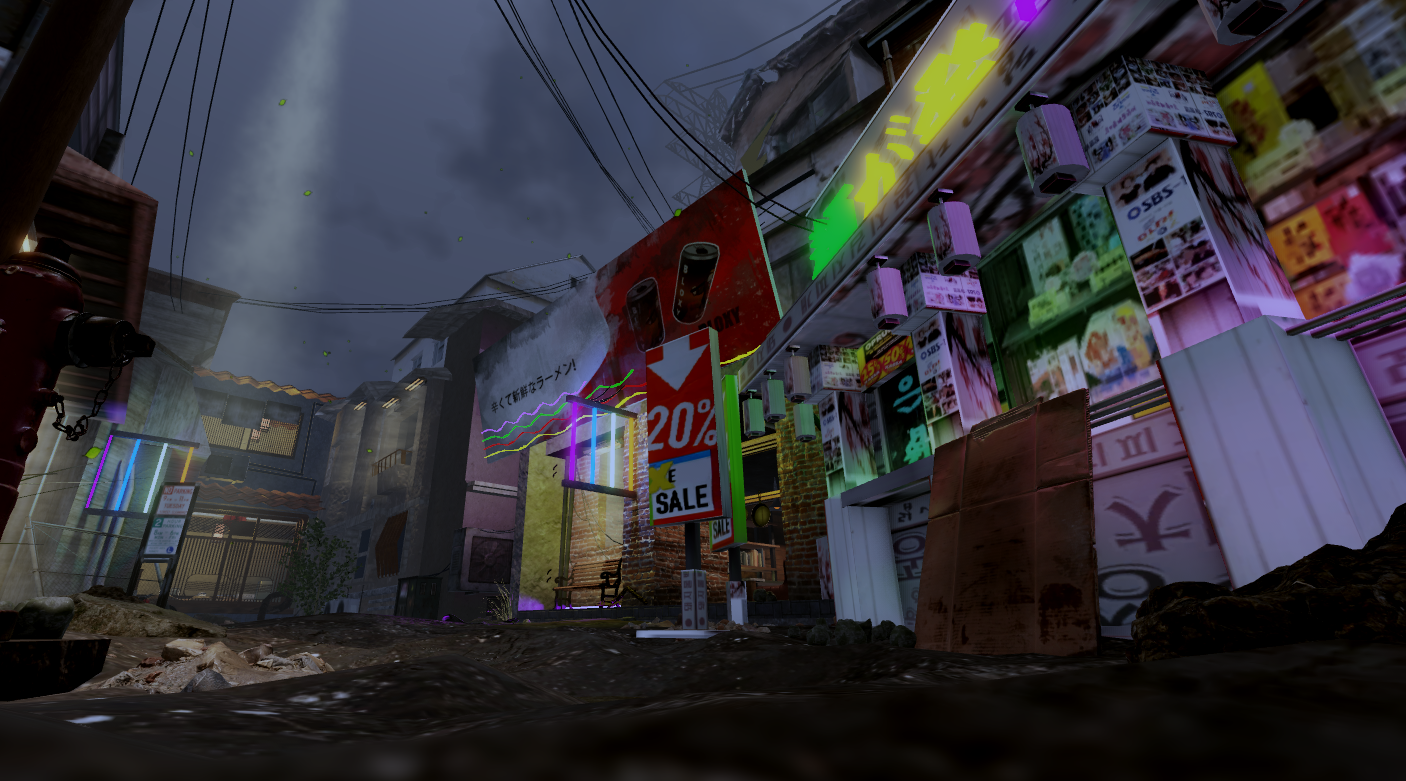 • Glowing, illuminated signs and banners for nighttime atmosphere.