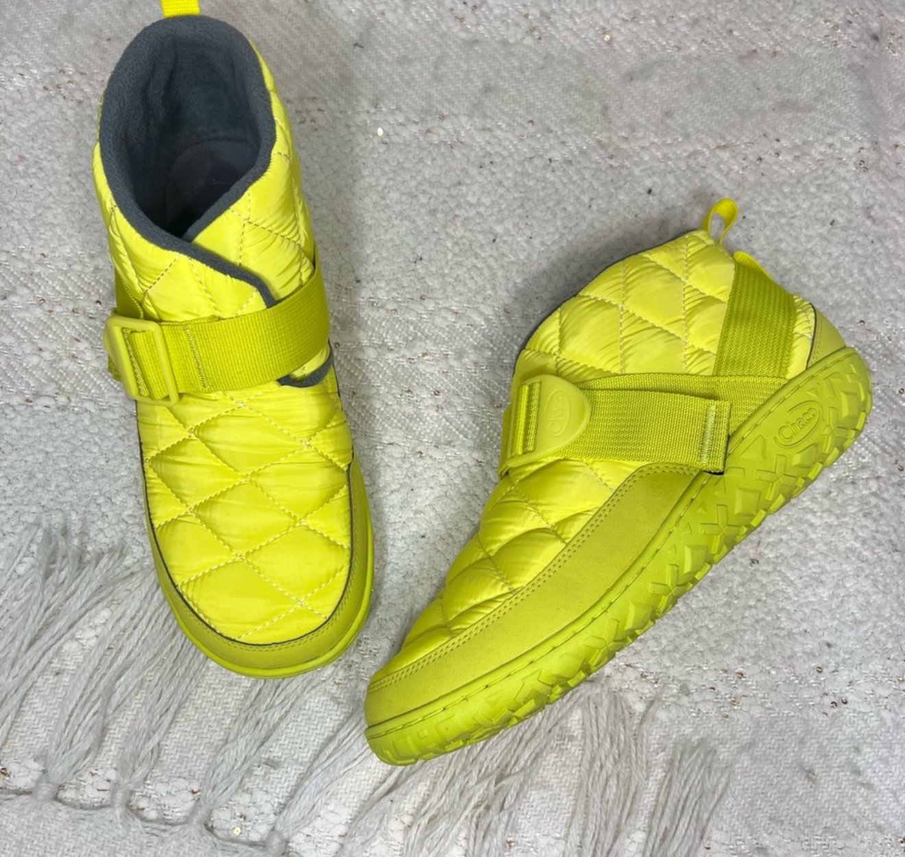 Chaco “Ramble Puff” neon yellow quilted nylon water resistant boots with an adjustable strap closure.