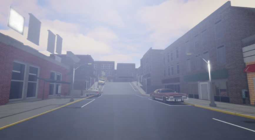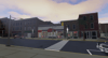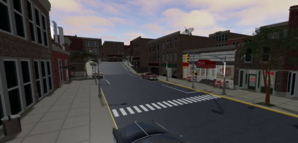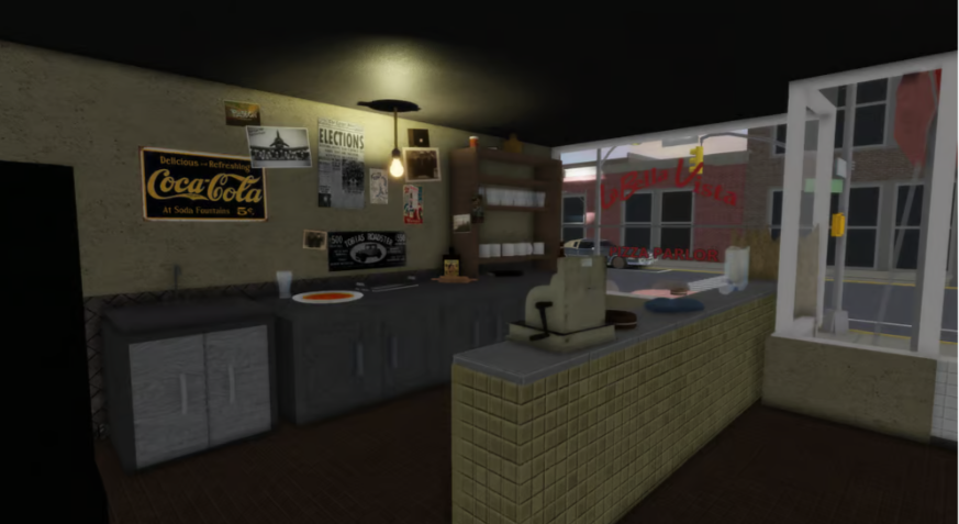 Featuring a pizza restaurant with interior and other exterior buildings as an avenue